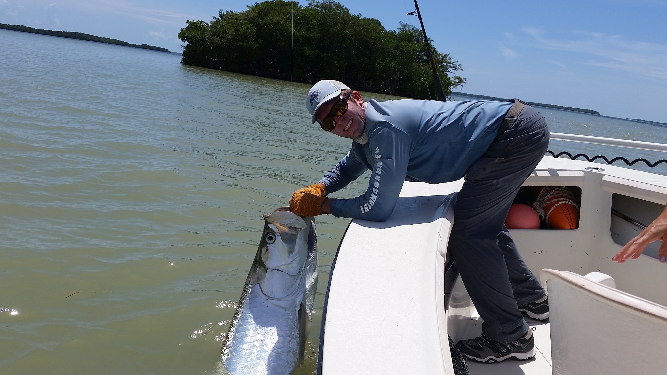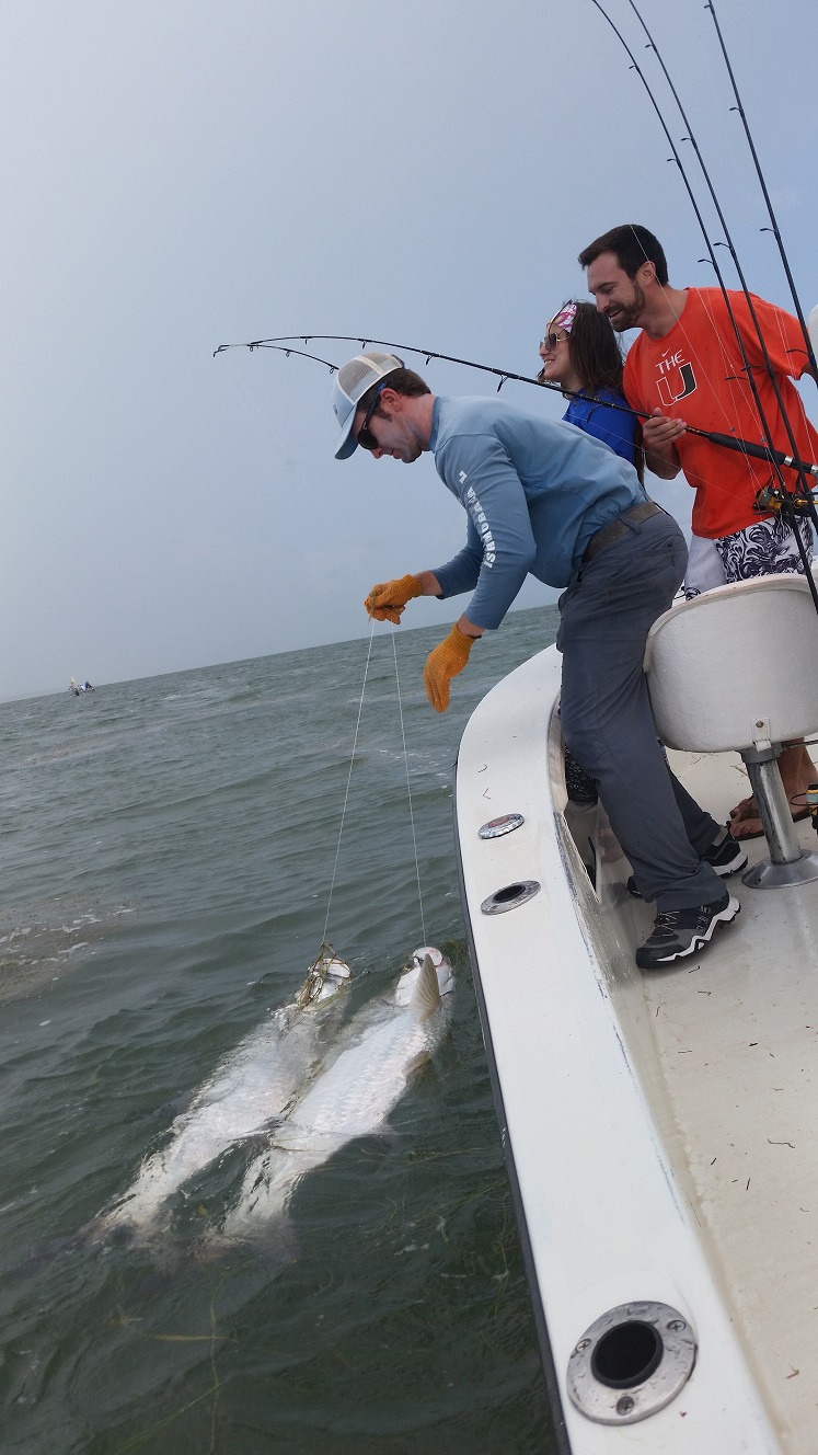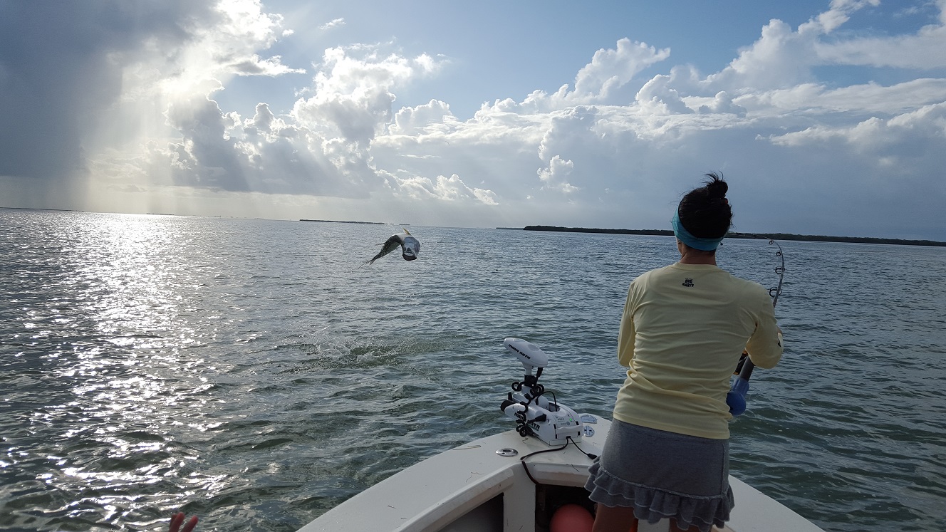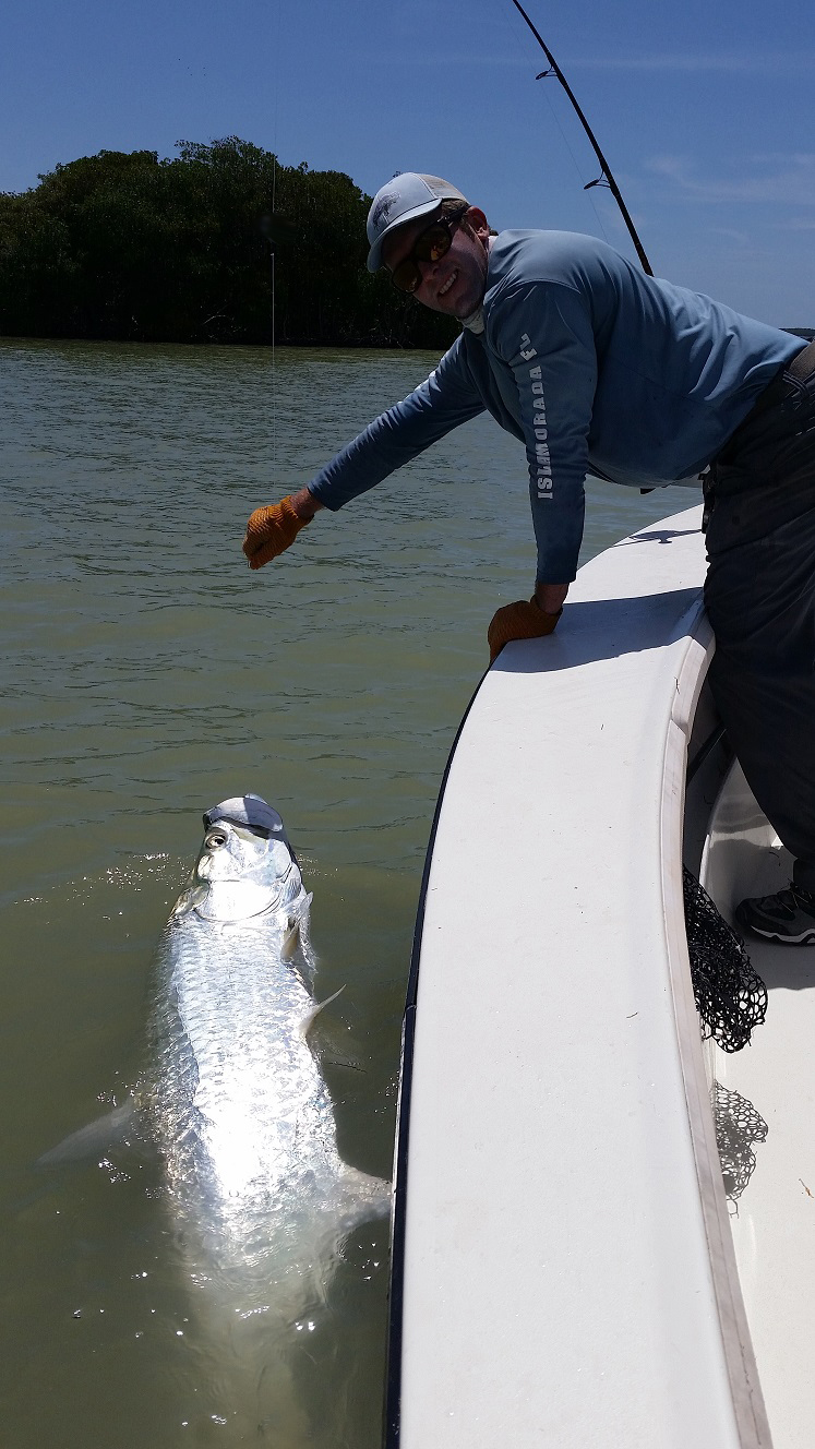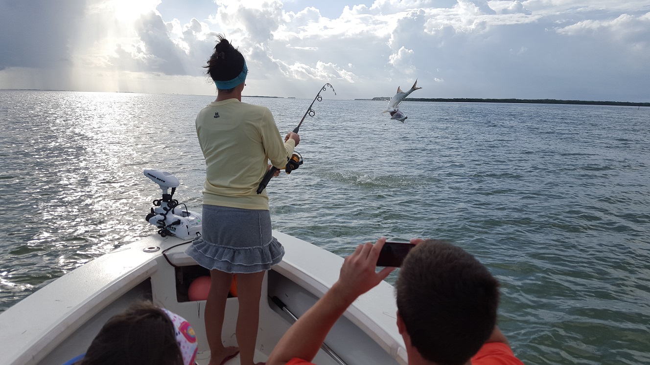 Got out with the family and friends today. We had some leftover mullet though caught a handful of fresh ones on the way over. Big rain storm blew up when we got into the backcountry so we were chased way up to the east, though were able to sit on the edge of it and fish in one of the channels. It worked out well for us, we hooked a double header tarpon right away that we caught! After that my wife Liz caught a tarpon too. Got in on the right hungry pack. After that we decided to try some snook fishing and we caught a few baits for that, though they weren’t easy. Picked away at some snook and a few other creatures. Then tried another spot for tarpon on the way home. A place I’ve never really tarpon fished before but have seen fish in a few times. It was worth it we saw a couple tarpon roll when we got there. Caught a big blacktip shark, then hooked something that cut us off we weren’t sure what it was, then finally got a 60 lb tarpon. I landed him myself, have not done that in a while! He came in pretty easily though only a 5 minute battle. Anyways great day and good to have success trying something new! Day off tomorrow though booked tuesday and thursday, maybe some other stuff will fill in to! 4 for 4