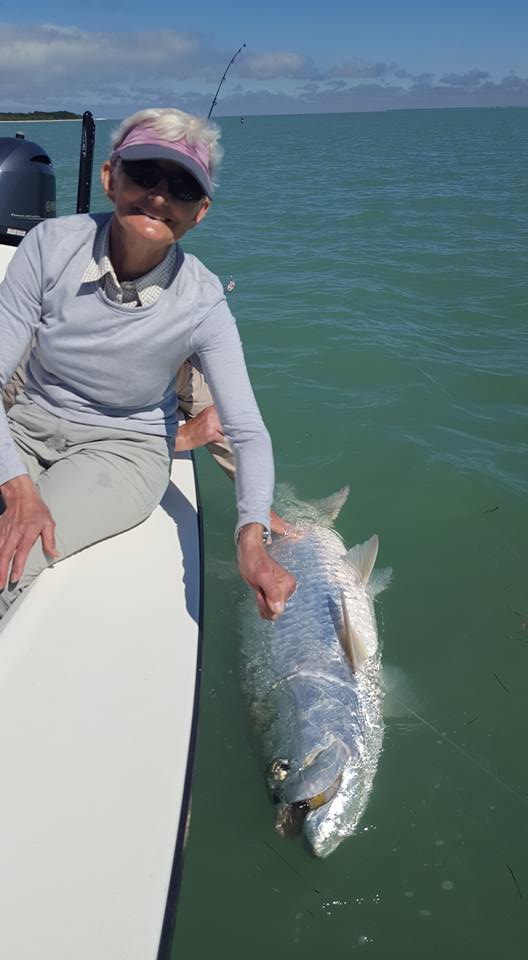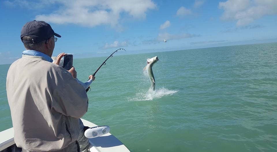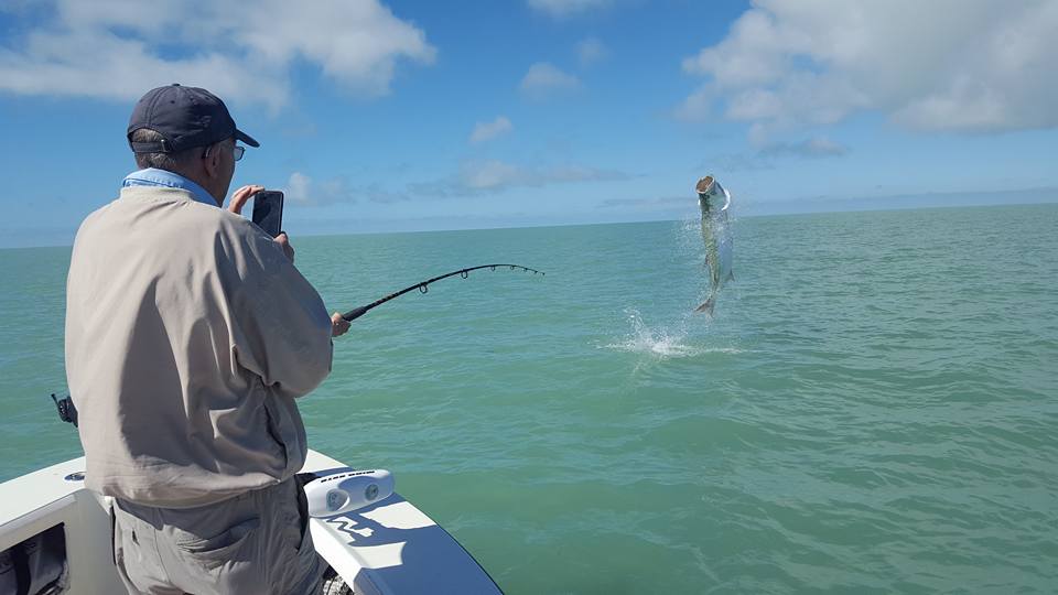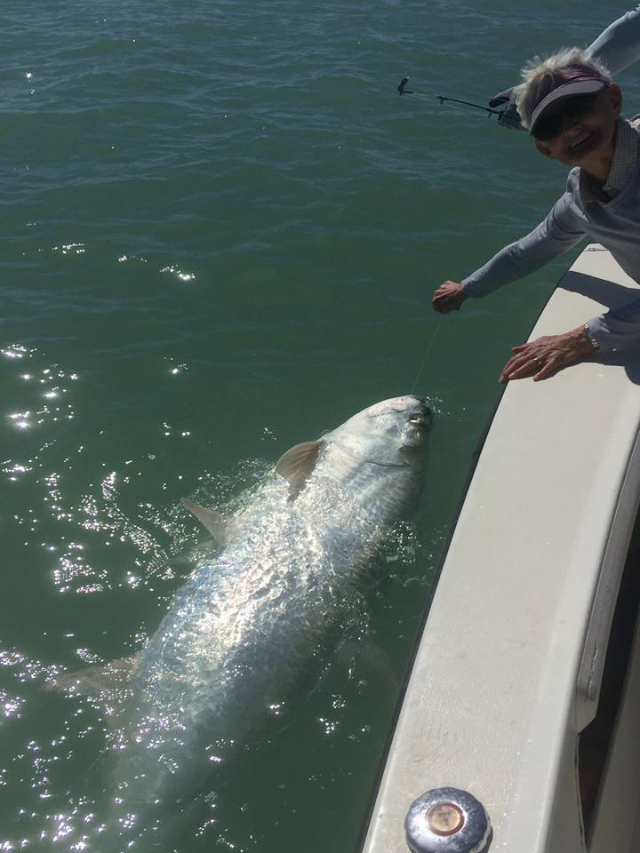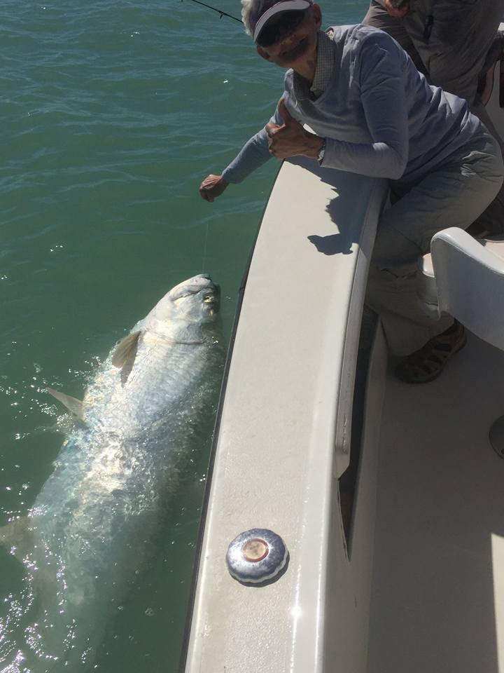 Got out with Doug and Caroline today who fished with me yesterday as well. Yesterday we did snook and snappers and had a pretty good 3/4 day. Today we decided to mix it up as the winds laid down some and tried other stuff. We caught mackerels in the morning along with some mangrove snappers, then decided to give the big stuff a try. It was still on the chilly side from the minor front/rain we had a couple days ago, water was in the low 70s. But it was fairly calm and sun was coming out, and looked like a tarpon-like day otherwise. We looked in a couple areas and didn’t see much, so we just put baits out on some numbers I like to sit at sometimes. We caught a few sharks, and then Caroline hooked a gigantic tarpon! It jumped immediately and I could tell it was big… It screamed about 150 yards of line off as we spun the boat around and got the trolling motor up to give chase. Caroline did great and kept the rod pointed at the fish early on, which is imperative when fishing circle hooks like we do. We caught up with the fish and it did some violent head shaking and made a couple more jumps right near the boat which we got good pictures of. Finally after one last jump it more or less gave out, a fairly short fight for a fish this size, only about 20 minutes or so. Once we got the fish boat side I realized how big it was… It was easily 7 foot long, but what stuck out in my mine was just the girth of the fish. All the way to the tail it was very thick, and most of the pictures don’t do it justice. But one shot that Doug snapped really shows how thick she was. We tried to measure it but we were in deeper water and the fish wouldn’t lay still easily, and I didn’t want to mess with it too long and possibly kill it. Though I’m guessing close to 200 lbs, and I don’t throw that number around often like some people like to. Anyways it’s easily one of the top 3 in size that i’ve caught and we were thrilled with the catch. Just goes to show you, you never know if you don’t try! 1 for 1