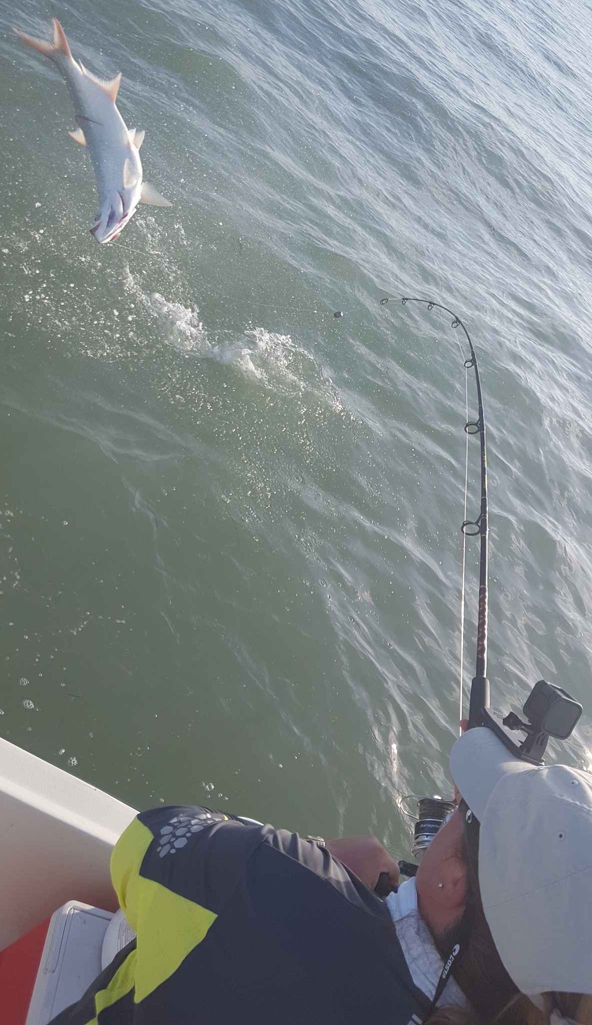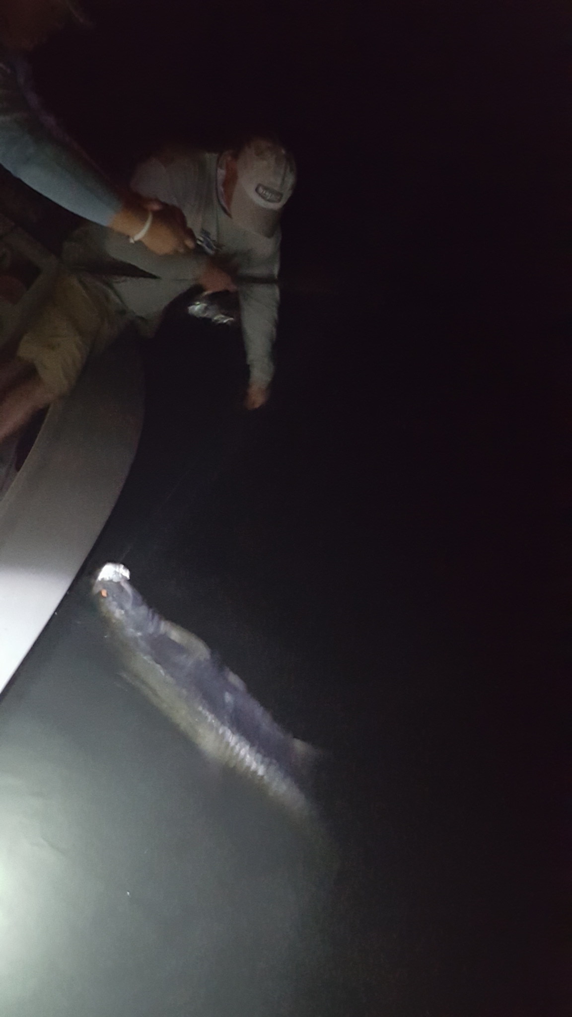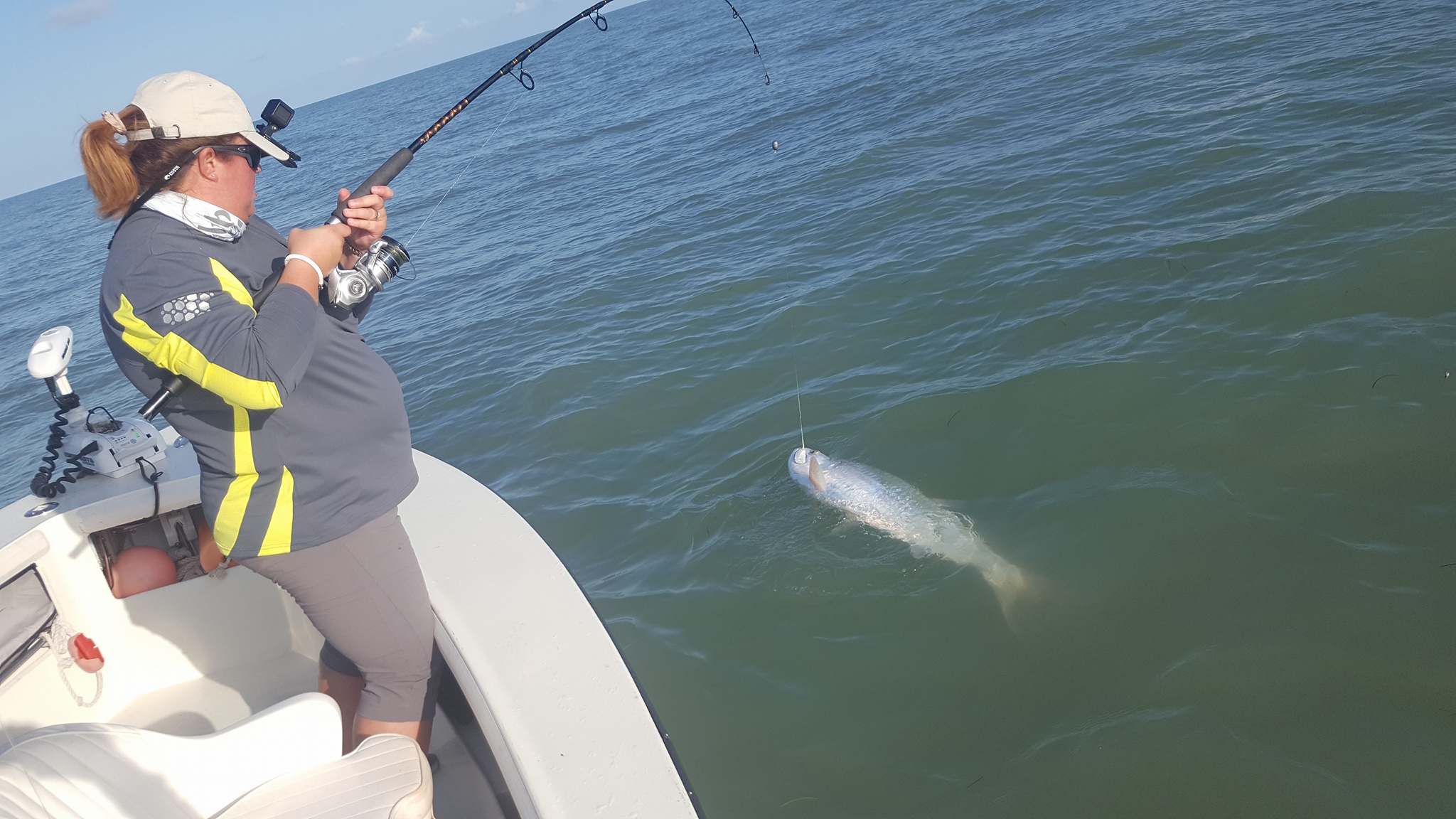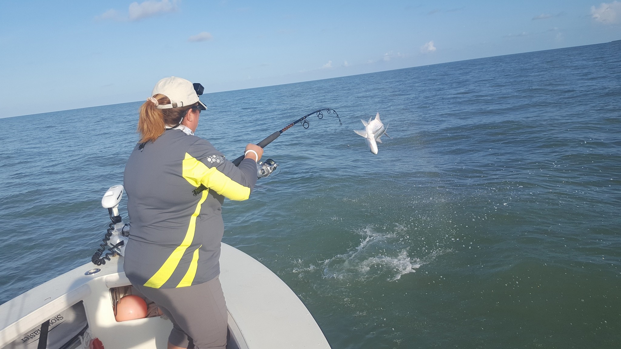 Got out with Sarah and Barry again today for our final trip. A couple days ago we absolutely smashed it with multiple tarpon and a bunch of snook and few redfish. Today though conditions changed and it was blowing 25 mph out of the south. I knew fishing would be difficult with the conditions, as yesterday it wasn’t quite as windy but we struggled for a single bite. We left a little earlier in the dark and hit one of the local areas. After 45 minutes or so barry hooked into a nice 70 lb fish. We were marking several on the machine too before that. We made fairly short work of the fish and headed back. Things seemed to quiet down, so I moved further down the channel, and didn’t see much but after 20 minutes, Sarah got into a nice fish. Not sure how big but it was dumping line, so I’d say easily a 100+ lber. Unfortunately as we were chasing her, Sarah had tightened the drag a little too tight and the wind-on leader just snapped! Strange because that is 60 lb test and it popped way high up on it, so I’m pretty sure it wasn’t a part of the line that would’ve had much weakness to it… Anyways this is a good lesson and could happen to anyone, as logically thinking you may want to tighten the drag to slow a fish down from running so much. However with tarpon… never tighten the drag real tight when a big fish is dumping line, unless you are about to run out of line. You’ll never stop a big tarpon with drag alone, and all that will happen is you’ll have too much pressure on the line and it’ll break at whatever point is weakest (usually at the knots, though in this case just the line itself snapped), or the fish will jump and possibly throw the hook (the more drag/pressure on the line, the greater chance a hook will be thrown when a fish jumps, especially if you are slow to bow to them). And with big fish that can move erratically and pull hard, sometimes you don’t realize you have a weak spot until it does snap. You only want to tighten the drag down hard when you have the fish mostly subdued and he is no longer making long, hard runs or going crazy jumping… basically when he is already ‘caught’ and you are just trying to subdue for a picture. Anyhow at least we had caught the other fish, and both Sarah and Barry had landed multiple tarpon on our other trip, so no big deal. After that unfortunately the bite was pretty much over with, we didn’t see much more for tarpon though in the last stop we made we did see a fish roll but didn’t get a bite out of it. Scheduled for a full day tomorrow but we may cut it short and try to do what we did today. 1 for 2