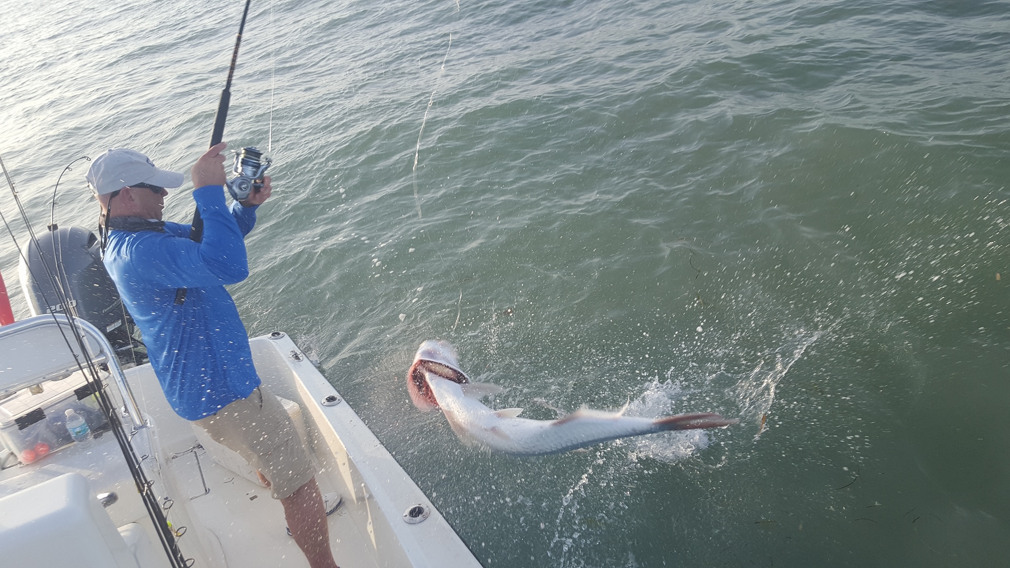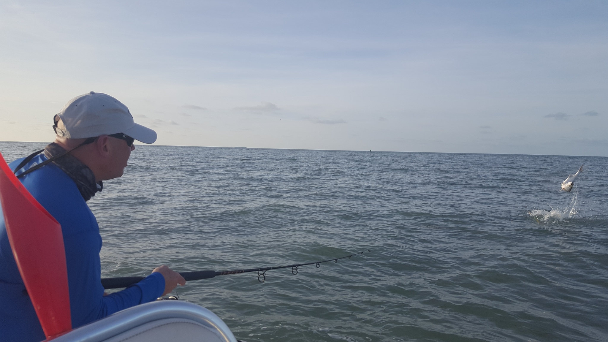 Got out with return customer Joe and his buddy Tim this morning for a tarpon charter. We had bait from the other day and only fished a half day so we stayed local. We found some fish early on with the last trickle of incoming tide before sunrise. We got a bite within 10 minutes, and Joe caught a nice 75 lb fish! After that I was hoping we’d get one more shot before the tide quit, but alas it was not to be. We ran out to the oceanside to catch the start of the falling tide, it was pretty windy out of the south but not too crazy. We didn’t see any fish rolling, but did see a couple jumpers so there was a handful around. But we didn’t get any bites after a couple more moves. We went down to the bigger bridges to try, saw a handful of fish rolling around the bridge. We saw one boat catch one and moved down nearer to that area after fishing a little bit. We caught a sting ray and never had another tarpon bite unfortunately. Anyways glad to have gotten one. I normally recommend doing 3/4 or full days to get into the backcountry this time of year, though with the wind blowing and rainstorms around today (and since we already had bait) sometimes staying local makes more sense. Though often the bite is early so better make those count like we did today! 1 for 1