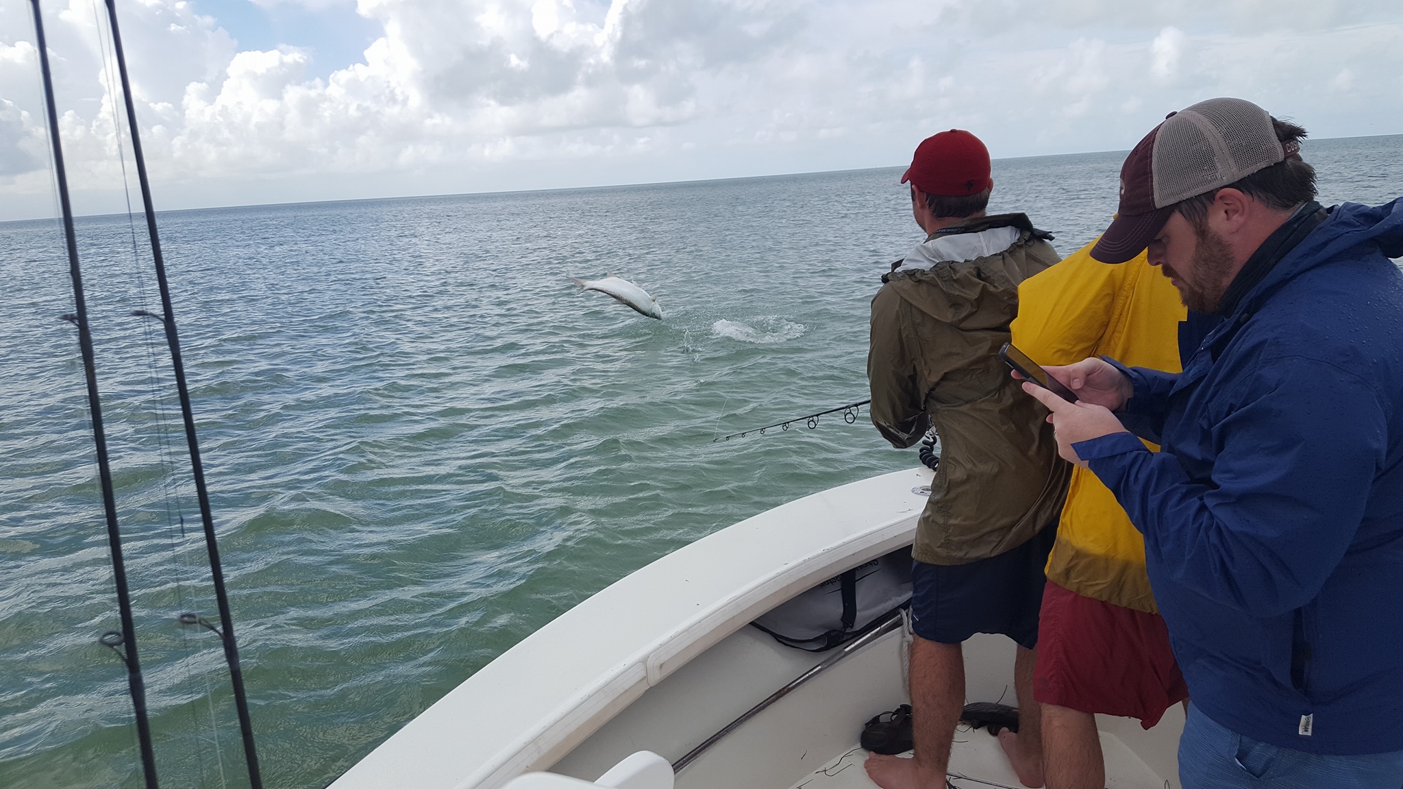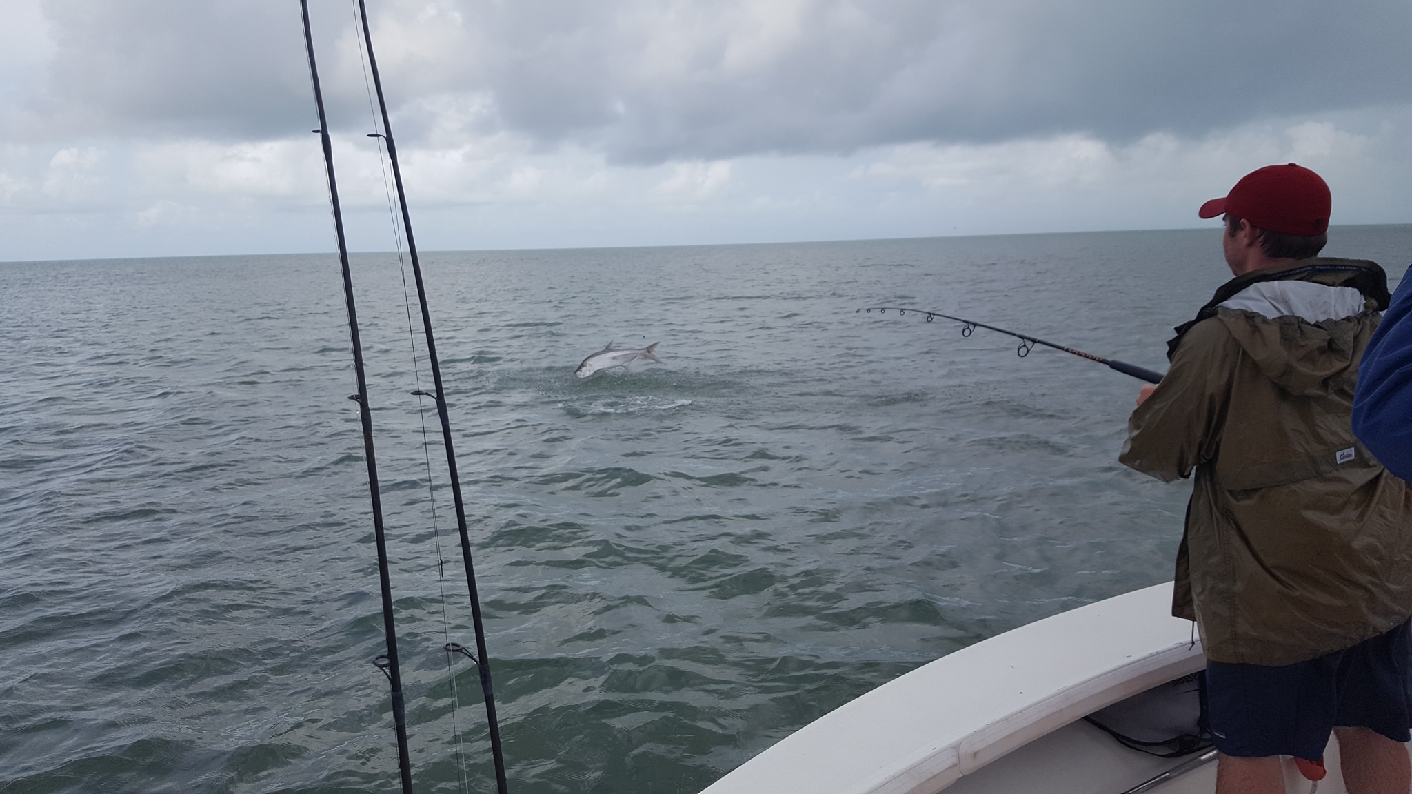 Got out with Scott, Charlie, and Roger over from Texas today for some islamorada tarpon fishing in the everglades national park. We headed out early and stopped to catch bait on the way. With the winds back in the eastern quadrant and not blowing insanely, conditions have vastly improved from last week. Bait was plentiful and easy to catch, we even saw some large balls of bait in several areas which is great to see… summer time bait is showing up! We headed straight to where we found tarpon yesterday morning. Marked a few on the bottom but not rollers. We couldn’t get a bite though, watched another boat come in about 20 minutes after us, and get two bites back to back and land 1 fish. Frustrating when that happens! I moved 3 times trying to get in front of some hungry fish, but just wasn’t happening for us so I bailed out. Was headed back to the mainland to try, though saw another boat coming back from that way who had part of the same party as me. He said there wasn’t much out there, so we just turned around and fished out towards the end of the channels we were just in. We got lucky and a few fish floated by us and soon we hooked one! After that we proceeded to catch two more, and saw a few rolling around too as storms came in. We got soaked, but it was well worth it. We left the fish for the other boat that was with us so they could try to catch some, and finished the day with some large lemon shark, a cobia, and some other sharks. Some days you just have to keep grinding on the tarpon to make it happen. It’s tempting after 3, 4, 5 moves to just give up and try for easier fish, but persistence sometimes pays off in a big way. That’s tarpon fishing. 3 for 3