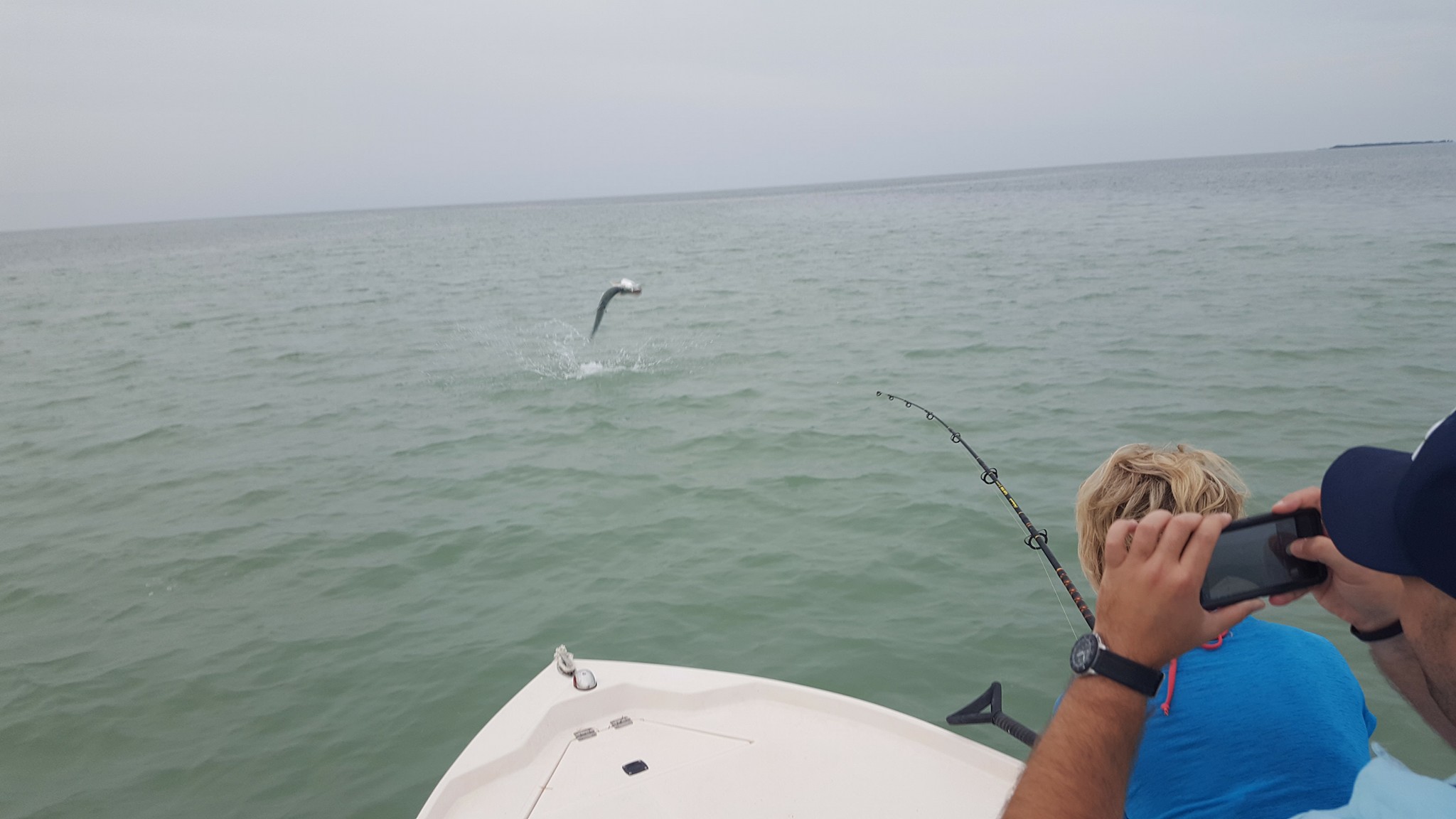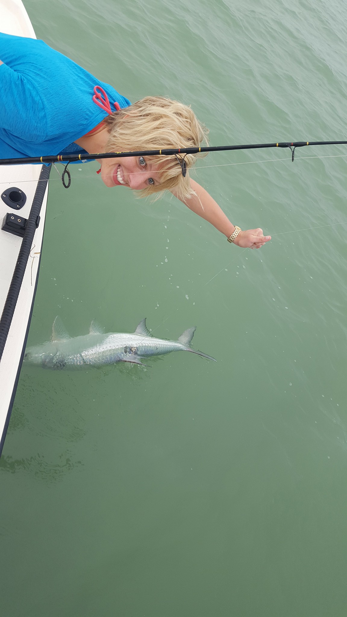 Got out with Chris and Caylee today for a 3/4 day. I told them it’d been tough the last couple days but they were down to give it a try and hold fast for tarpon. We mixed it up and I tried some other areas. We found a load of tarpon first thing with the last trickle of incoming tide after we caught bait. Tons of bait around too which is good to see. The little sharks were pretty bad but we got through them and Caylee caught a 50 lb tarpon and then later on a 25 lber. After the tide quit things slowed down, I hoped when it started falling the tarpon would turn back on. But they seemed to have moved on. We tried further up the channel and found a handful more, but no more bites they seemed like they were in a weird mood. We tried a couple other spots, and got some more big sharks and some big jack crevelles, but that was all she wrote for the tarpon. Oh well any day you get one is a good day, so I was thrilled we caught a couple – Especially after how slow the last couple days were. Hopefully they’ll stay put and be there tomorrow, have a couple more days booked then open Wednesday and Thursday if anyone wants to go. 2 for 2