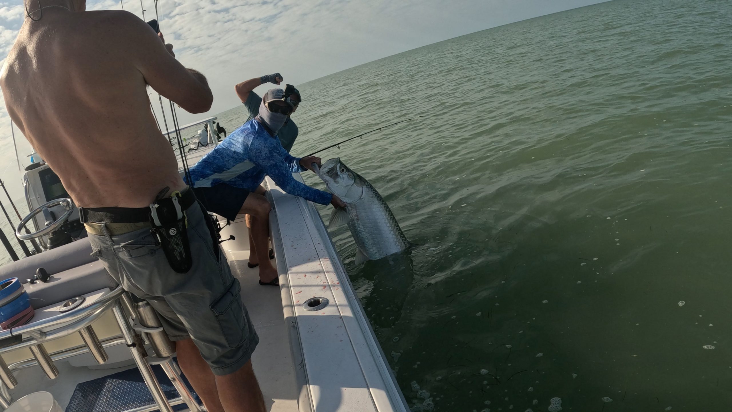 Got out with repeat customer Irv and his buddy Billy. Irv lives down here in the winter and has fished with me for quite a few years now, as does Billy. We were able to make a last minute skip trip happen this coming week (leaving tomorrow) but luckily Irv was able to go today as we were suppose to go tomorrow. Conditions looked great we had fairly calm winds and it’s gotten nice & warm lately – spring has sprung! I was able to catch some bait Friday since I was showing one of my new captains a little about fishing and saved that for the day. We got out early at 6:30 AM and made it back to the tarpon grounds quickly. At first glance we didn’t see a whole lot… I spent some time rigging and scanning the horizon but alas, not much as far as visible fish jumping and splashing as they like to do. Then we ran another couple miles north down the beachlines and bingo – huge tarpon airing out free jumping, sometimes 3, 4, even 5 at a time! A few fly fisherman were in on them too but for the most part it was a lot of wide open water calling us! We set up and had the last trickle of falling tide for an hour or so. It was dead low tide but the current often runs about an hour or so after the level hits low. Sure enough we got into some good groups of fish we could see them splashing and marked them on our fish finders. We had to put a little time in and there was no by-catch, just sitting and waiting for a bite! But we hooked into 4 good tarpon and landed all 4 of them. Not monsters they were all 40 to 60 lbs… fun size as I like to say as you get a good fight and nice acrobatics but you aren’t pulling on some monster for an hour +, and you can often get good pictures by the boat as they’re more cooperative with that. I think Irv landed 3 and Billy got 1. We had a couple others grab the baits and just spit ’em out before we even knew what happened. Once the tide turned the tarpon seemed to spread out a lot and then the sharks and other junk moved in. We decided to give the tarpon a break and tried some large snook spots which was productive… we landed 4 big snook in the 15 to 20 lb range. What an unbelievable finish to just an awesome day! I don’t have too much left in March but I do have a few days open, and I still have a few dates left in ‘prime time’ April & May. I have a feeling we’re on the verge of some epic fishing this year as the water quality seems much improved in the backcountry and I guess call it just gut feeling but I think we’re due for a really good season. One thing also I know the red tide up the coast is very bad right now and while it’s a terrible thing there, it sometimes leads to good fishing where we are as the fish don’t want to go north into that stuff. Time will tell I suppose!