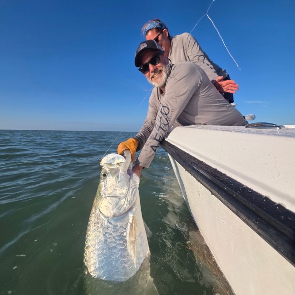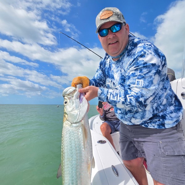 Getting right on along here in April and had a busy week tarpon fishing here again. Had a bit more wind again this week with another late cold front blowing in Tuesday. While the temperature didn’t get super cold it blew about 25 knots and had the northeasterly direction so it definitely did drop water temps from what they were down to low 70s from near 80 what it was Monday. So Monday I had Ian and Brooke, regulars who have fished with me the last couple of seasons. Tarpon fishing was pretty good again this day was nice and calm. We found fish in the backcountry where we’d been getting them the last couple of weeks. Ian had a nice one to start the day within the first 15 minutes. We got it boatside several times but it ended up chaffing through the leader before we could get a picture. Which he really wanted because we hadn’t been able to seal that deal. Luckily a little later he got another bite and that one cooperated we got the nice boatside picture! We ended up jumping three or four more fish in the next couple of hours didn’t even really have to move so really good fishing. After 10:00 or so things slowed down we did find a pack of fish free jumping and busting offshore from where we were but we didn’t get any bites out of them though got into some big sharks of course. So the next day was a complete 180 on Tuesday. I had Ian and Brooke again and it was blowing a gail, steady 25 knots I would say about as windy as it gets for us to fish. We were able to get to the same area just hugging the banks carefully for the ride. Once we got there it wasnt too bad as the backcountry areas are often protected by shallow water so that was nice. Fishing was slow to start we tried the same little area and did not have a sniff there. As mentioned the water temps were a bit colder but still not out of the realm of tarpon biting I didn’t think. We moved a few times and tried another nearby channel but no luck aside from a sawfish and a hammerhead shark which was cool. We ran a little ways to check another area where I had found some smaller fish the week before. We ended up stumbling into a pack of them rolling and set up and lucked out we had seven or eight bites though only landed one fish but it was lots of action. One of those days where we had to hunt them down though as opposed to the day before where we were able to just sit and wait for cruising fish to come by. So Wednesday then I had Karl and crew visiting from Maryland. We did the backcountry again the winds were still blowing pretty good though not as crazy as the day before. We pounded it out in that area where we found those little fish the day before and they were in there but not as happy today. We moved a few times and after an hour we hooked one but it came off spitting the bait right away. We fished a bit more and just had some shark action. The tide quit on us and once it started falling we worked an area where the fish had been the day before. Sometimes you find some edges or live bottom where the fish seem to congregate more and this was what we’d found as when we snagged bottom a few times we pulled up some sponge and live bottom. And the fish had been laying here multiple times where we had bites. Sure enough we got another one there we landed. That was it for the day. Thursday it got nicer it was still a little blustery but a steady 15 mph so we were able to run across the bay getting out. Tried that same area again and sure enough we got a nice 60 lb fish to start the day. A big shark ended up spooking it though after we got it boatside and it broke off but got away I’m pretty sure which was good. We did not hook any more after that though we did get into a good pack of fish which I was surprised didn’t bite as we marked them on the sonar multiple times right on our baits. After the tide started slowing down I decided to run back down to long key bridge to check that out. I hadn’t been there yet this year and we got there right on the tide change. I did mark a good group of fish right where we first stopped and we put our baits out and within 5 minutes Karl hooked a nice one! We jumped it off unfortunately but then his buddy John hooked into one about 10 minutes after that which stayed on. We had an excited battle through the bridge a few times. Got it boatside fairly quickly for the size fish that it was a good 130 lbs or so. But a big hammerhead got after it and we broke it off. It was an exciting view watching the hammer chase it around but not much we could do being right next to the bridge. We tried again for another hour and the tide started ripping in then but we did not have another bite. So all in all we had a consistent week of catching tarpon every day. So good fishing when it was nice and then of course got a little tougher with the cold front and extreme wind but we still were able to make it happen. Next week it looks like it’ll be calming down and hoping we have a very exciting May. I think the bridge fishing will hopefully be a little more productive later into the season this year as I think that happened last year too though I was fishing the backcountry mostly at that point. But time will tell. I don’t have anything left until a few days in early June. Capt. Steve has a handful of evenings and days available in May and much more in June. June can still be great fishing so if you want to set something up give us a shout!