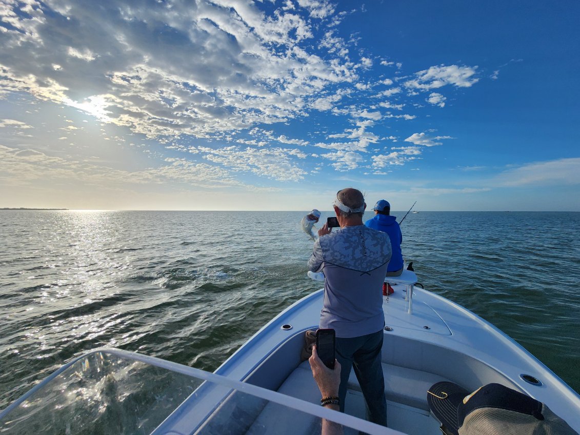 Got out again after some tarpon with Adam and his friend Matt visiting from UK. Tarpon was on the list and we headed out into the everglades where we’d found a huge group of fish the last few days. Conditions were still favorable slightly more wind but not bad at all. We had good incoming tide until 10/1030 AM or so but got an early start to try and take advantage, as the falling tide afterwards has been very weak on the recent cycle and not much going on then. Anyways the bite was a bit slower than the last few days we jumped around a good 4 or 5 times and had nothing but shark activity. We were seeing a few tarpon all spread out but you could really feel the difference they just weren’t congregating and schooled up thick like they were the previous days. Who knows if thats weather or something else they weren’t liking. But finally we did get a bite and hooked a big dog that Matt fought well. He almost dumped the spool on us and acted very much like a big shark as he didn’t jump for the first 5-10 minutes. But luckily we chased after him and get him the benefit of the doubt! We got that fish on the leader but once we tried to put the wood to him for rolling him over, the hook pulled. But a leader release none the less. After that we wound up in a good school of fish where we ended up so we stopped and put them out right there. Pretty soon we hooked another one on a live grunt which was cool! Adam said he had a feeling that was gonna be the rod and he was right! This fish we got up boatside and the boys got pictures I didn’t get any myself but we were trying to be quick as I’ve mentioned the sharks have been so bad you don’t want to mess around with pictures too long or too much. That was about it for our tarpon action we fought a big shark for about 40 minutes after that and had a few more blacktips before the tide quite. We tried for a big snook at the end of the day and did catch a few big jacks and other sharks on light tackle. But anyways glad to have gotten a couple fish we definitely were keeping our eyes on the fleet and not nearly as many hooked or caught today overall but that’s fishing. Hopefully tomorrow is a little better but the good news is they are there and we don’t have any cold in the forecast so you should still have a good shot regardless if you are fishing near now! Give me a shout if you want to get out for tarpon this spring.