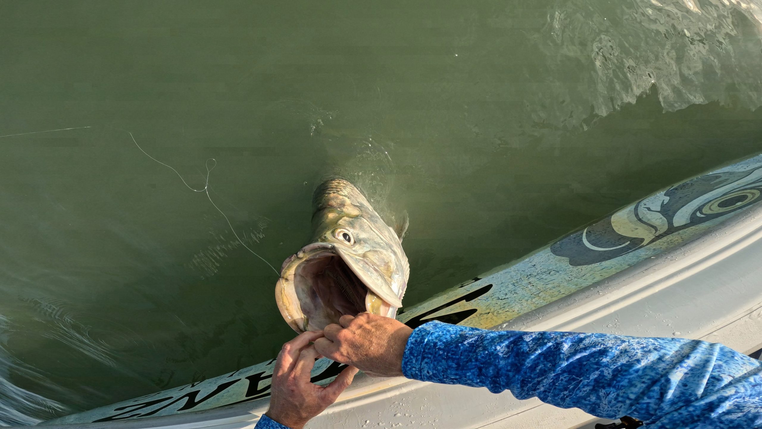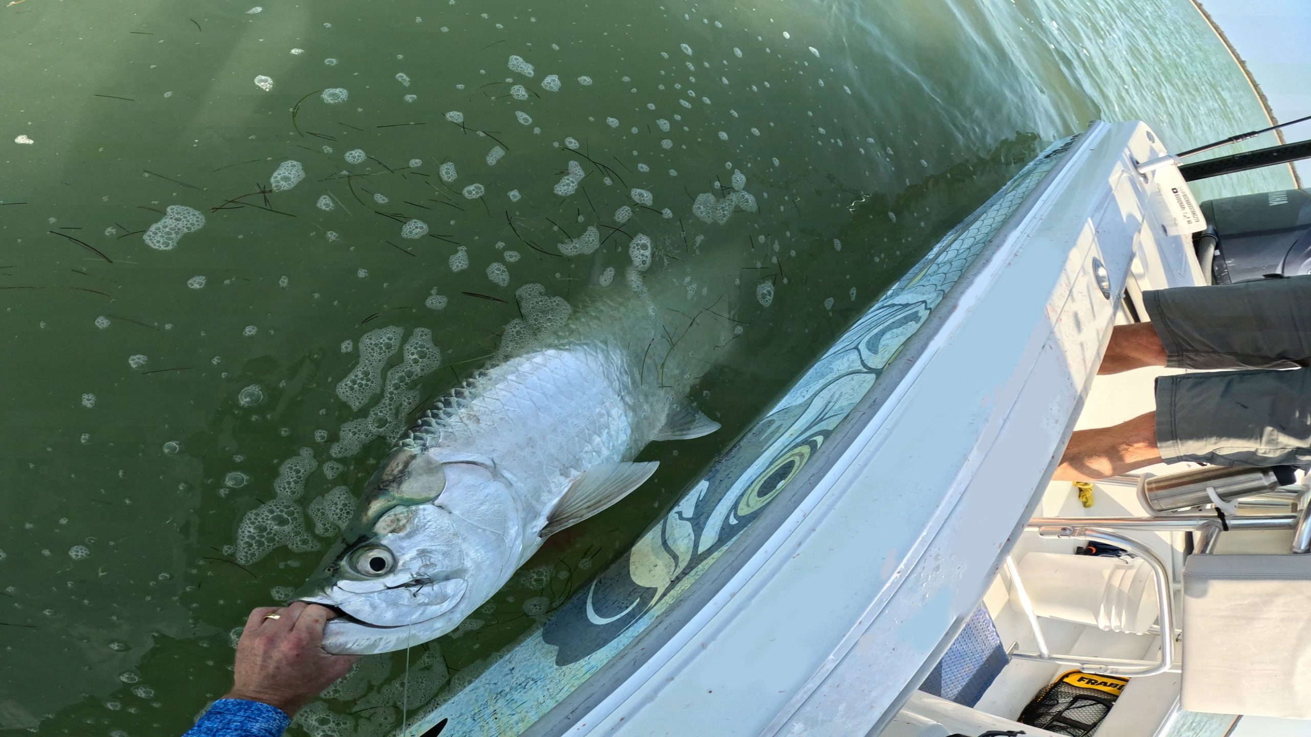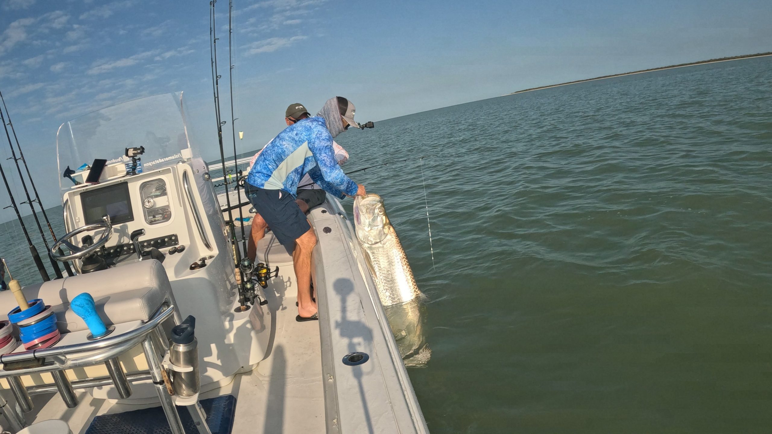Got out with repeat customer Irv and his buddy Billy. Irv lives down here in the winter and has fished with me for quite a few years now, as does Billy. We were able to make a last minute skip trip happen this coming week (leaving tomorrow) but luckily Irv was able to go today as we were suppose to go tomorrow. Conditions looked great we had fairly calm winds and it’s gotten nice & warm lately – spring has sprung! I was able to catch some bait Friday since I was showing one of my new captains a little about fishing and saved that for the day. We got out early at 6:30 AM and made it back to the tarpon grounds quickly. At first glance we didn’t see a whole lot… I spent some time rigging and scanning the horizon but alas, not much as far as visible fish jumping and splashing as they like to do. Then we ran another couple miles north down the beachlines and bingo – huge tarpon airing out free jumping, sometimes 3, 4, even 5 at a time! A few fly fisherman were in on them too but for the most part it was a lot of wide open water calling us! We set up and had the last trickle of falling tide for an hour or so. It was dead low tide but the current often runs about an hour or so after the level hits low. Sure enough we got into some good groups of fish we could see them splashing and marked them on our fish finders. We had to put a little time in and there was no by-catch, just sitting and waiting for a bite! But we hooked into 4 good tarpon and landed all 4 of them. Not monsters they were all 40 to 60 lbs… fun size as I like to say as you get a good fight and nice acrobatics but you aren’t pulling on some monster for an hour +, and you can often get good pictures by the boat as they’re more cooperative with that. I think Irv landed 3 and Billy got 1. We had a couple others grab the baits and just spit ’em out before we even knew what happened. Once the tide turned the tarpon seemed to spread out a lot and then the sharks and other junk moved in. We decided to give the tarpon a break and tried some large snook spots which was productive… we landed 4 big snook in the 15 to 20 lb range. What an unbelievable finish to just an awesome day! I don’t have too much left in March but I do have a few days open, and I still have a few dates left in ‘prime time’ April & May. I have a feeling we’re on the verge of some epic fishing this year as the water quality seems much improved in the backcountry and I guess call it just gut feeling but I think we’re due for a really good season. One thing also I know the red tide up the coast is very bad right now and while it’s a terrible thing there, it sometimes leads to good fishing where we are as the fish don’t want to go north into that stuff. Time will tell I suppose!