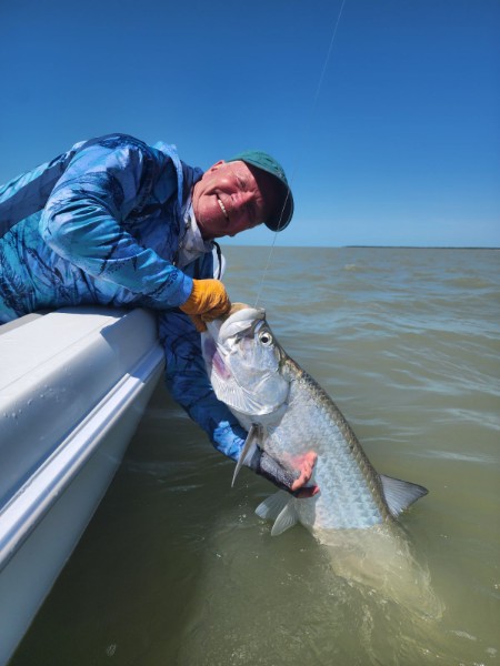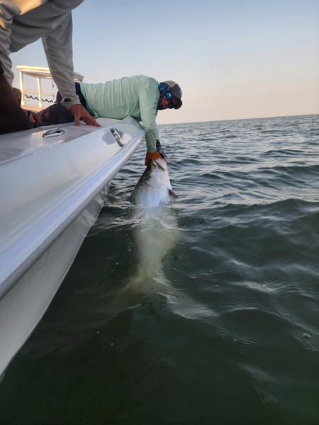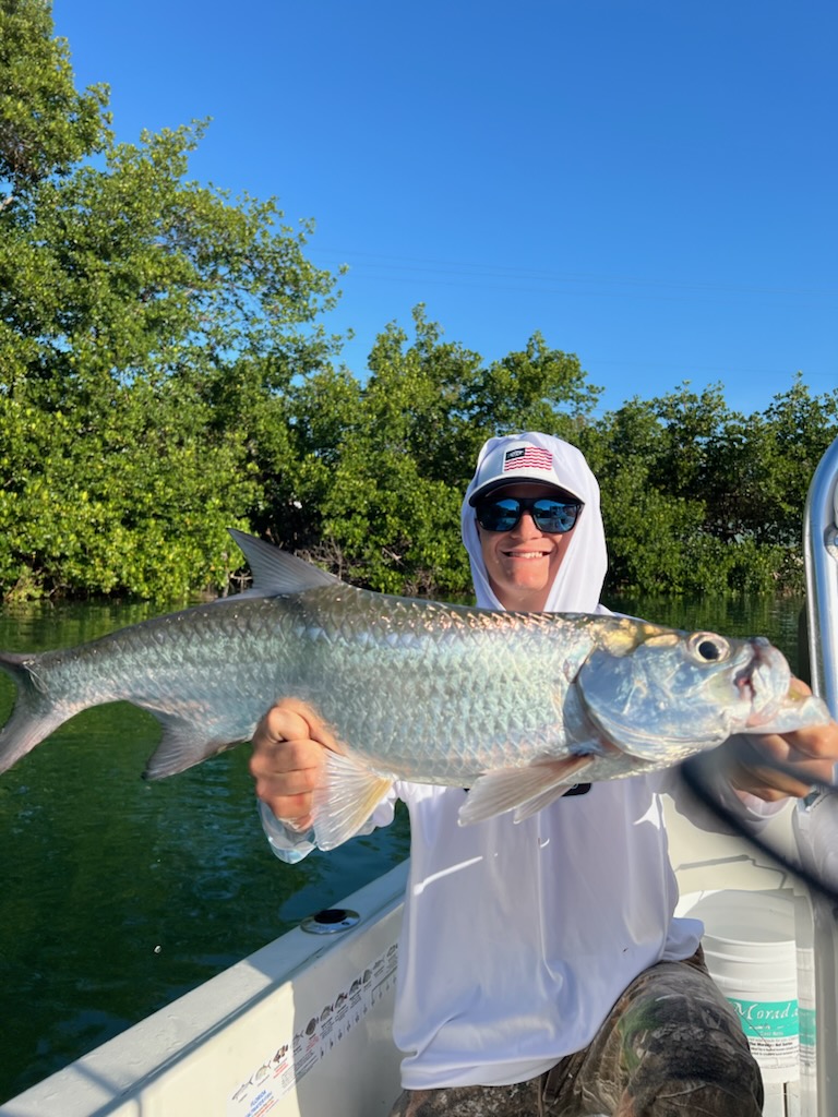 Got out for a couple days on 3/13/24 and 3/14/24… tarpon fishing again in the everglades backcountry. The winds swung back around to easterly/southeasterly, which is what we like this time of year in the spring. The weekend before as mentioned we had a late mild cold front, so the winds had done a big loop from south to west to north… though it did not actually get very cold at all. We had fished in that north wind the day before and still caught some tarpon. So on Tuesday we had good fishing we ended up catching 4 tarpon… one very large one in the 130 lb class, and others of various sizes. Bob, bobby, and Joe all got to land one and almost all got good pictures with there fish boatside! Sharks weren’t bothering us so we were able to do this – often times we can’t anymore these days because of them. And we did have to break one fish off boatside to avoid letting it get eaten. I will say the bite wasn’t necessarily ‘red hot’ as those were the 4 bites we had all day. But that is still great fishing to land 4 tarpon in a day I’ll always take that!
