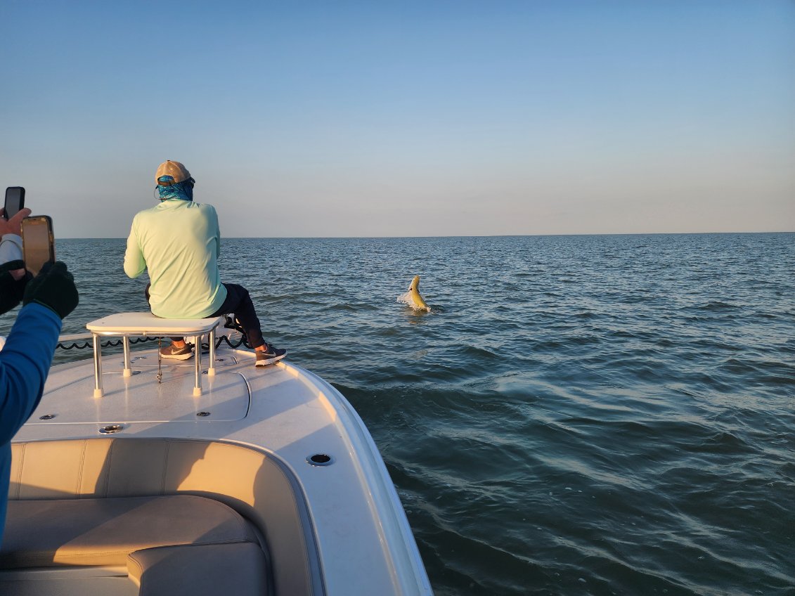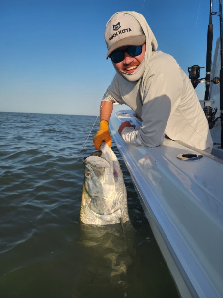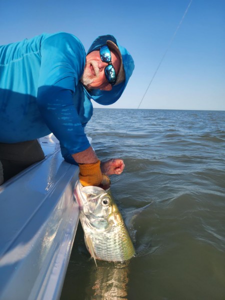 On 3/14/24 the fishing was honestly very similar we caught one bigger tarpon first thing. We then jumped around for an hour or two without getting bit again, though the tarpon were all over the place flopping and jumping! I did notice it seemed not many people were hooking up it was a big fleet out there. But eventually we did get another one and Bob got his chance to get a facegrab on one. After that it went kind of quiet again but then all of a sudden we jumped one more fish, and a few minutes later hooked another and caught it. Then we finished up with one more a little later. So we went 4 for 5 on the tarpon… another good day indeed! I had heard the incoming tide in the late afternoon the fish were a little happier, but that can all change day to day and even hour to hour sometimes.