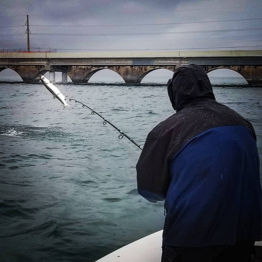 Got out with Terry today for a half day trip. The weather didn’t look great some big showers around. But we ventured out anyhow. Caught some bait early and went around the bridges. Found a bunch of fish, but surprisingly they weren’t very interested in feeding. We had a couple blow ups on our baits in the first hour, but no actual bite, and they didn’t come back after the first attempt. Very strange! It looked just perfect… overcast, nice incoming tide, and fresh bait, you can’t really ask for anything more. Anyways the rain started to pour and we moved around. The fish seemed to spread out and we found them closer to the bridge. After another move we had a few rolling behind us and finally got one up boiling on a bait. Finally he ate and Terry was hooked up to a nice 60 lb tarpon! He put up a good fight with some nice jumps, took us through the bridge and into the bay. We landed him and got some release photos. Great fish and was glad to get one. A few other boats shows up but I didn’t see anyone else hook up. Just hard to beleive I’m not sure why the fish are so tough to get to bite as of late. Anyhow after that we went and caught a few snappers by the bridge for lunch and headed on home. Terry was thrilled to land a silver king! 1 for 1
