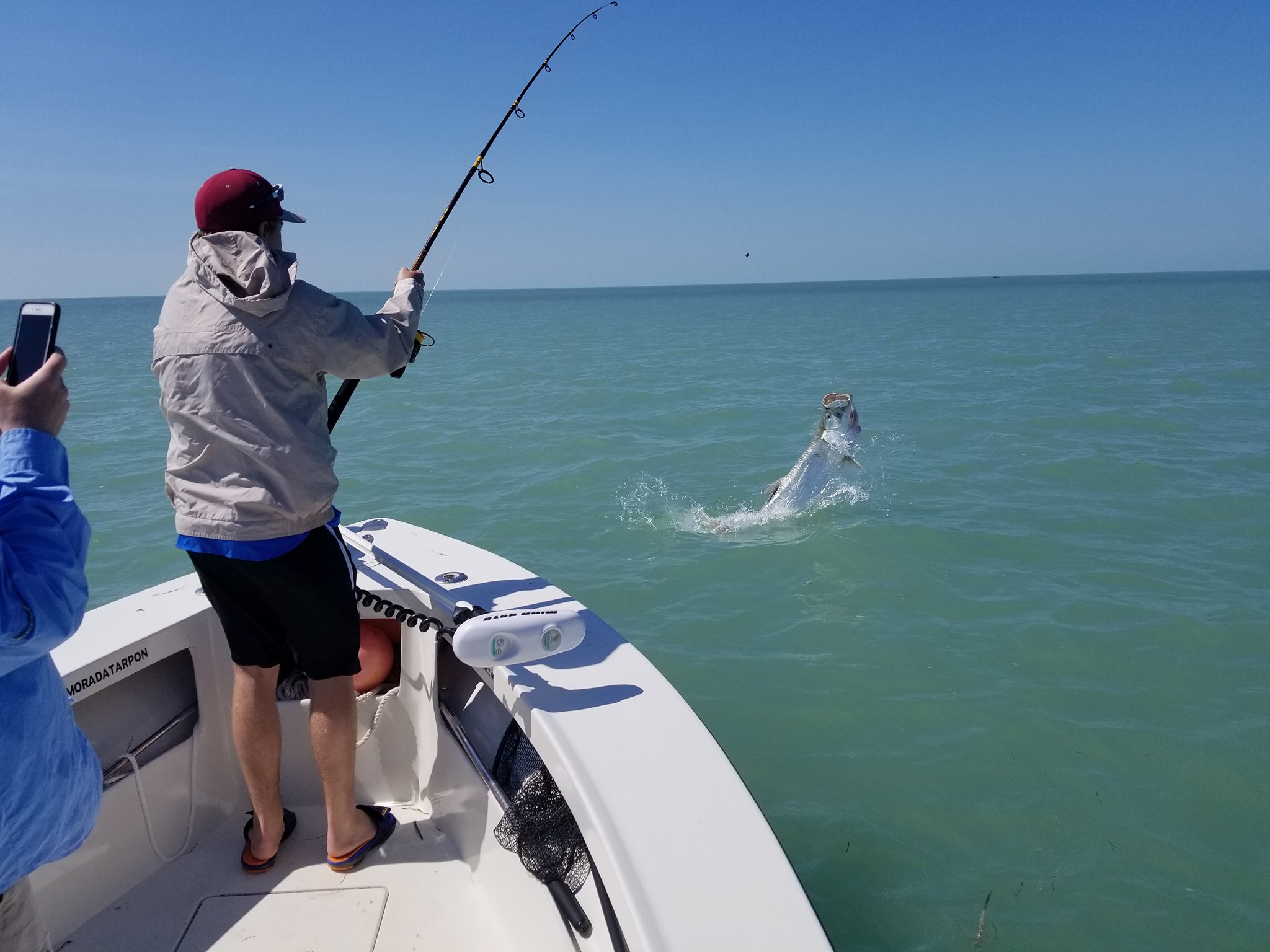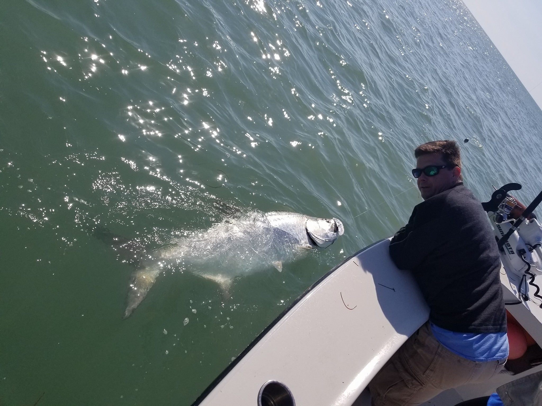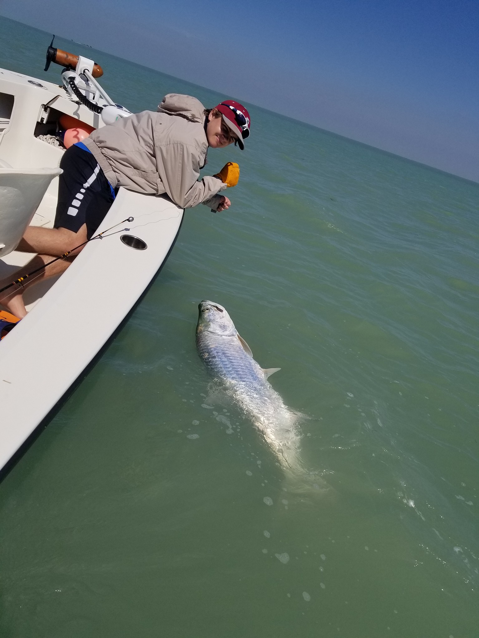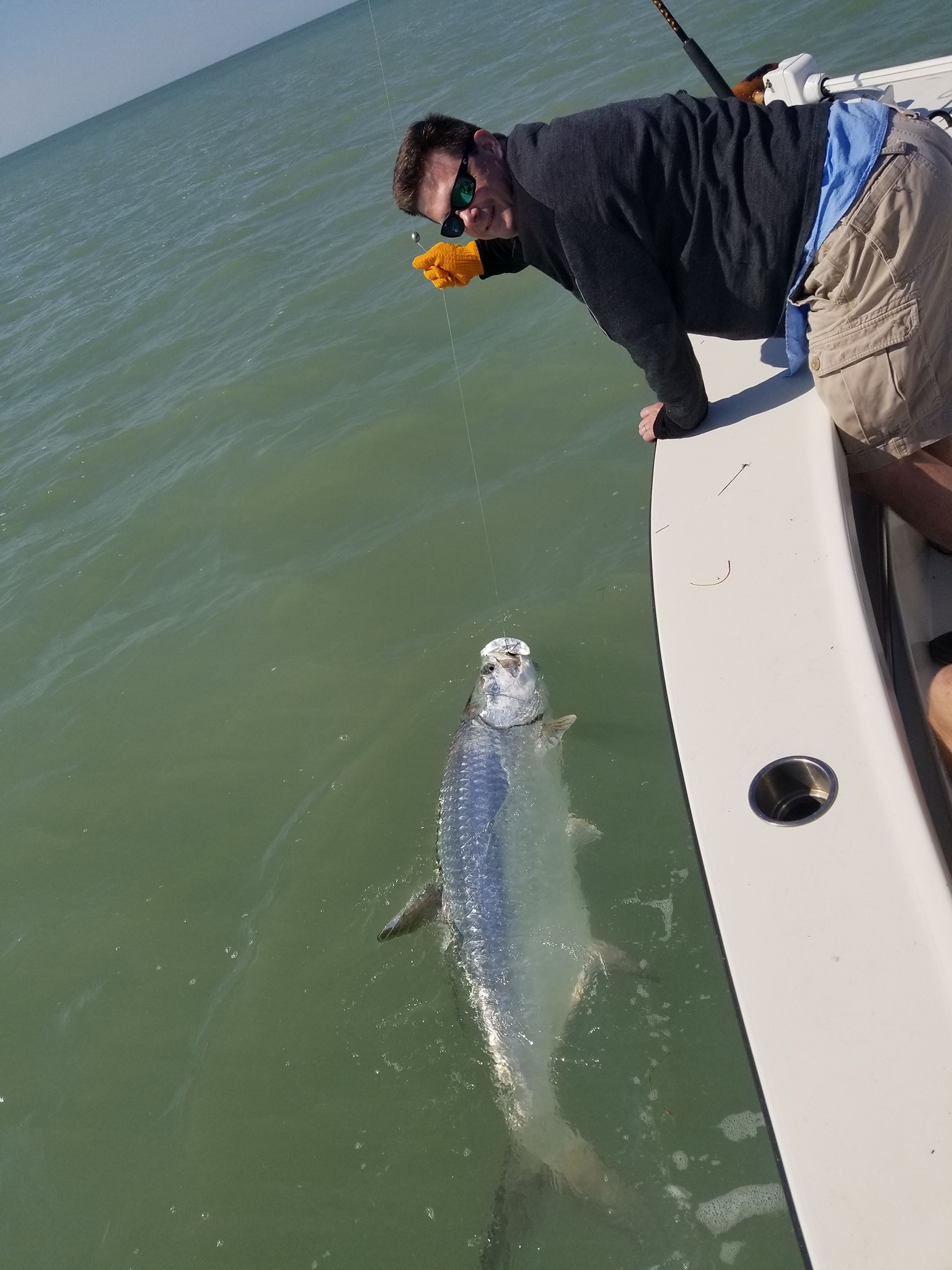 Got out for a full day today after having the last couple days off. The winds slicked off nicely yesterday and things got to really warm back up and I heard some tarpon had moved back in. Today the winds were slightly breezy but not too bad. We found some bait had to work for it but managed enough to fish with. We found a decent amount of tarpon in one of the areas where they were before the front. Sharks ate us up pretty good in the first stop, but we moved around and soon hooked a nice 90 lb fish for Matt! He fought it well and we got it boatside for some pictures. Later on we caught a few more sharks including a cool hammerhead. Then Matt’s son Will got a nice 80 lb tarpon. After that we gave the tarpon a break and looked for some snook which Matt hooked a nice one but we lost him unfortunately in the sticks. We finished the day up catching some nice mangrove snappers for dinner. All in all a great day on the water, though unfortunately we had some motor problems on the way home and had to get towed in. Luckily we were fairly close to home so it was only about a 45 minute tow home. Had to give my trip away tomorrow and take my boat into the shop since we couldn’t figure out what was wrong. Hopefully they can diagnose and fix it quickly, though luckily I have another skiff to use for the rest of the week. At least we got to get our day in though and it was a good one! 2 for 2