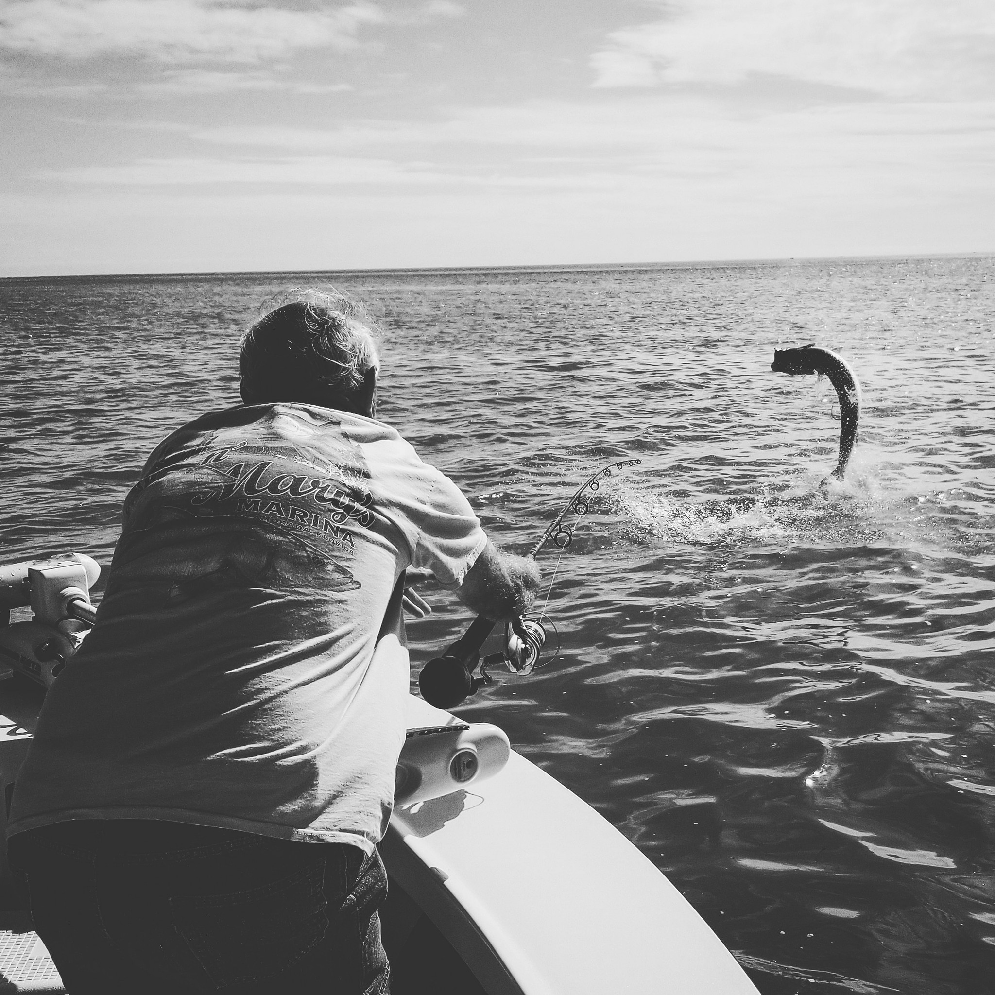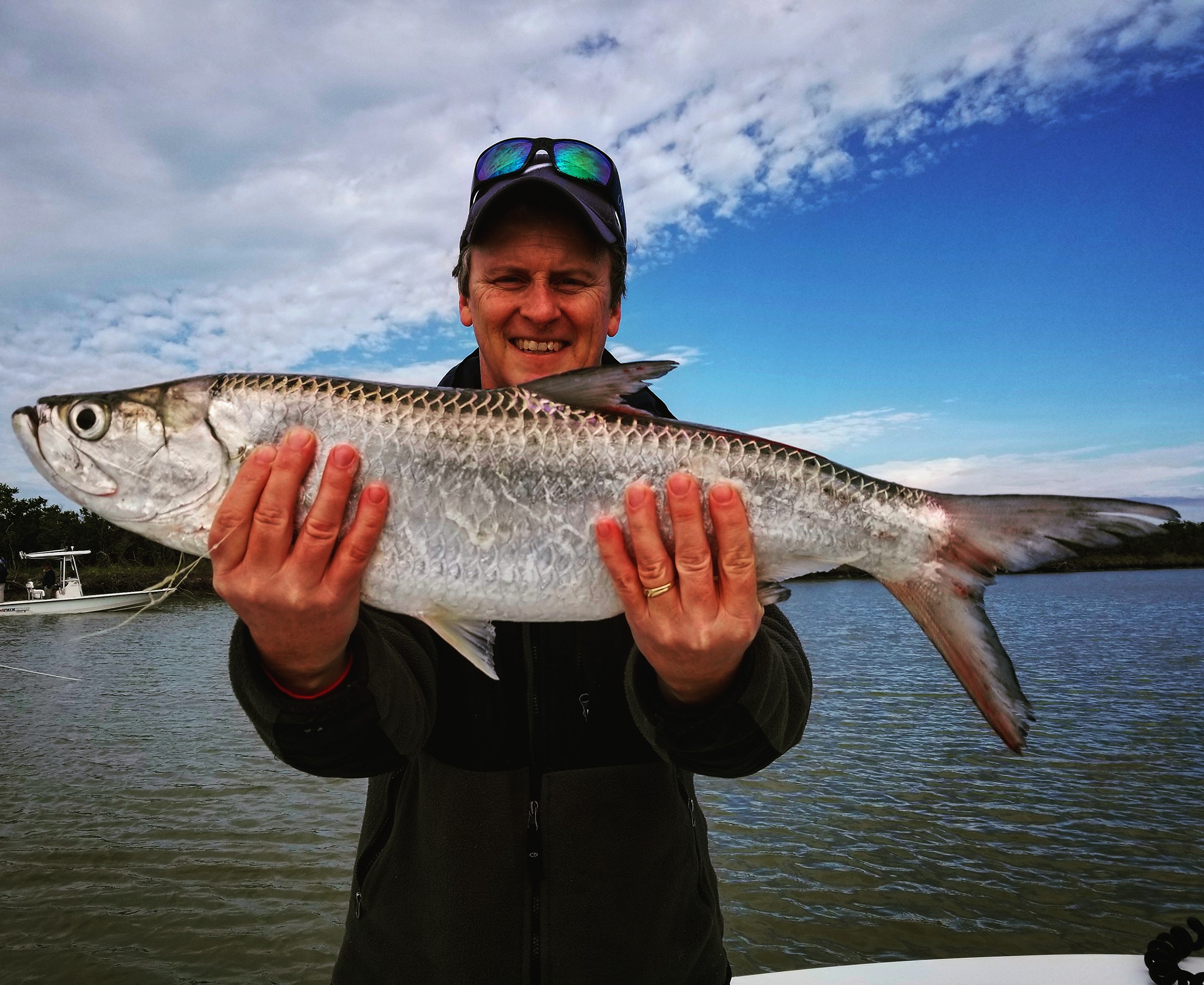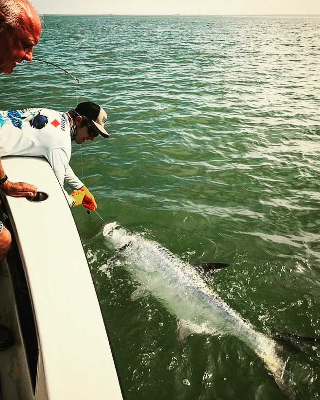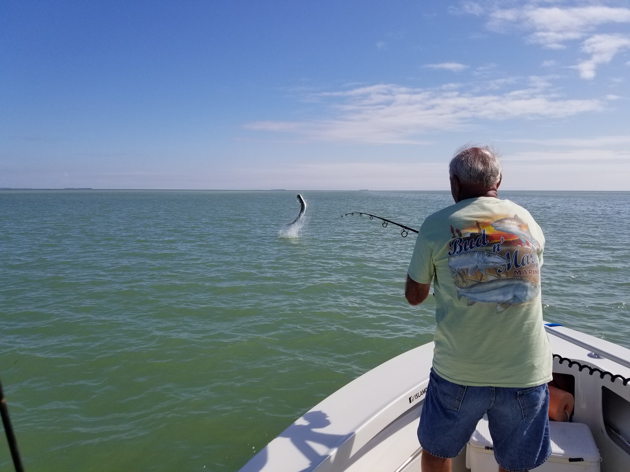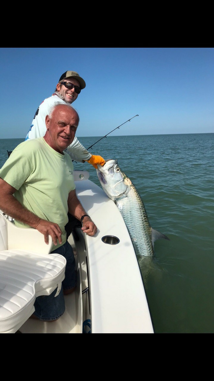 Got out with my regulars Jim and Gwen today. We mixed it up a bit and did end up trying some tarpon fishing today. Yesterday it was flat calm so the water temperatures did rise nicely. I had heard reports some tarpon had shown up in their usual haunts. I had a banner day with Jim and Gwen a couple days ago with lots of big snook and drum, so figured we’d give the tarpon a go as Jim always love to catch them. We caught some mackerels in the gulf to start our day and that was OK, good action fishing we probably caught a dozen or so. When we hit the tarpon area, we caught the middle of the falling tide and didn’t see much to start with. The water temperatures were still in the high 60s when I got to the area. I did mark a few tarpon however, and we just set up and gave it a go. We had a couple sharks early on, and then I saw a tarpon roll so had some visual confirmation they were there! Soon after we hooked a nice 85 lb tarpon that Jim caught, and it was all smiles and high fives after that! As the tide continued to fall, the water temperatures continued to climb. By the time we left they got all the way up to 74 or so, and it wasn’t a super sunny day. But I guess the shallow water on the flats was warming up the deeper water as it came off. We did see more tarpon later on, and did have one more bite before it was time to go but he didn’t stay on the hook for us. Plenty of more sharks too including a very large blacktip/spinner shark. Anyways I gotta say I didn’t really expect much when we got there but it ended up being not too bad. 1 for 2