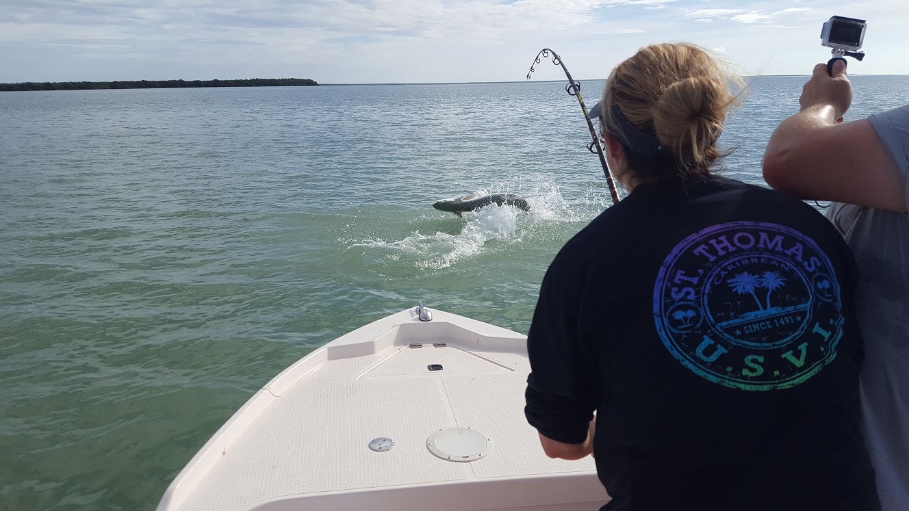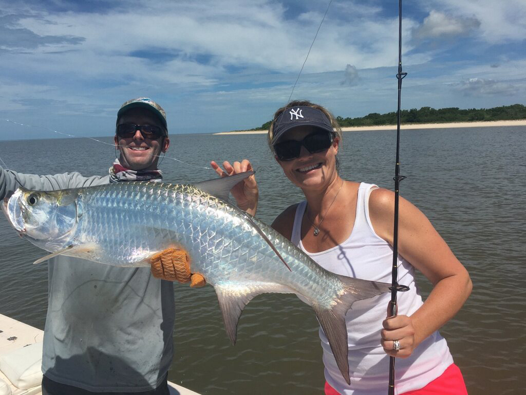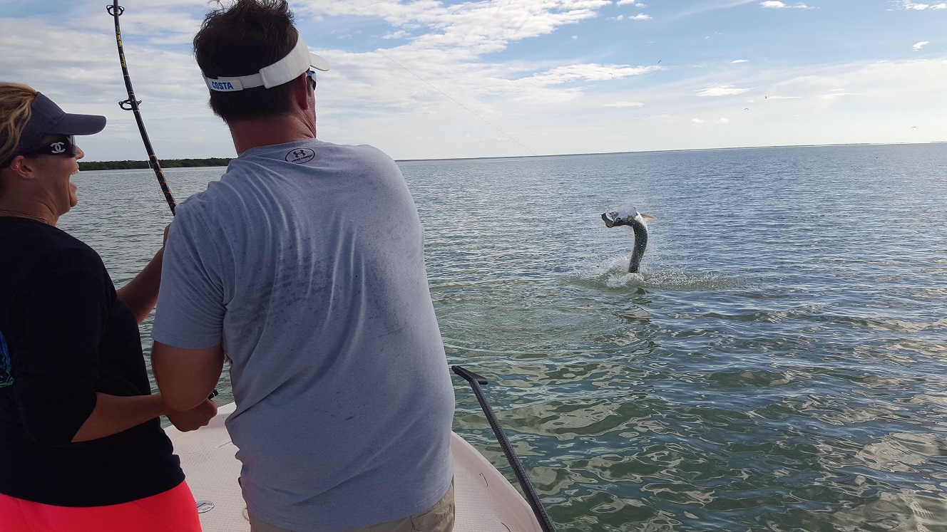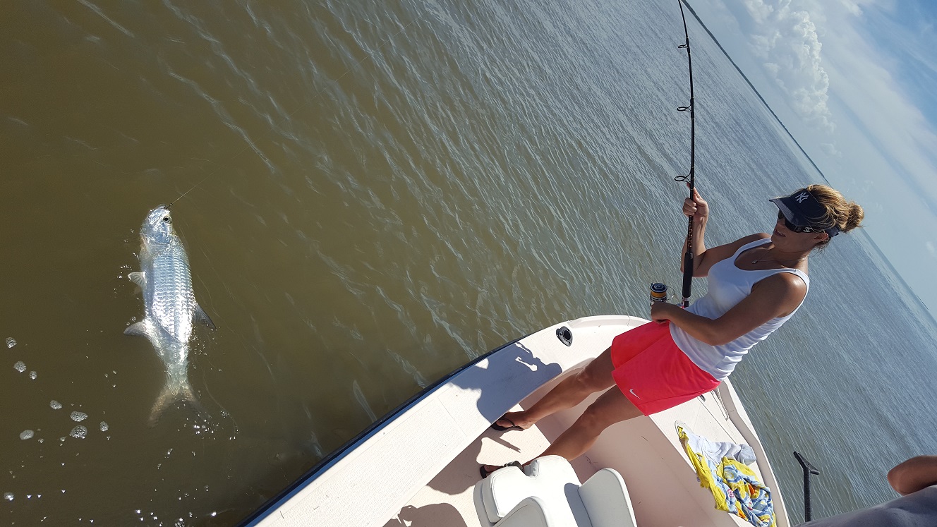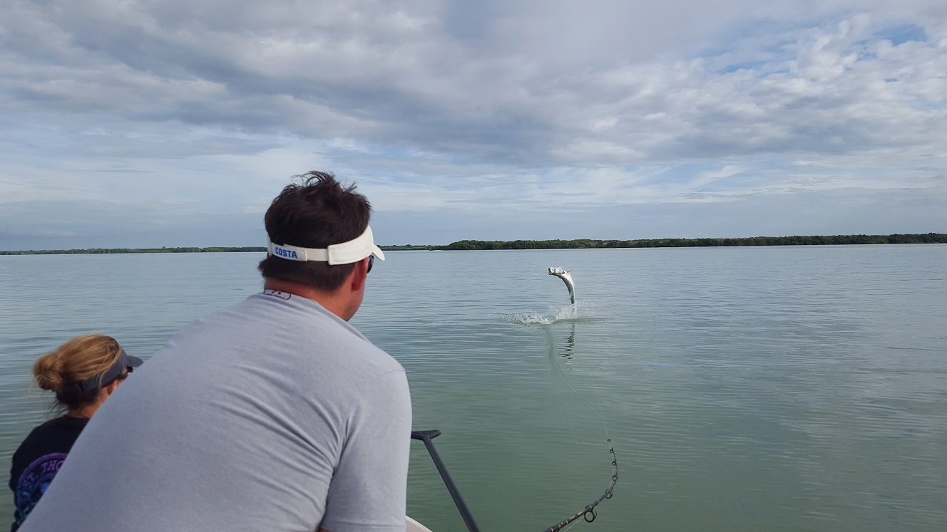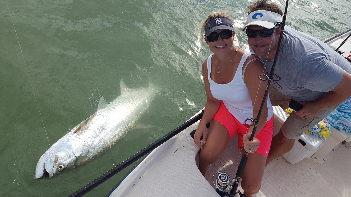 Got out with Chad and Michelle today for a 3/4 day after some tarpon. Had very light southerly winds, not my favorite direction but it wasn’t howling so all was good. We caught bait on the way there and hit some channels. Didn’t see much activity early, we sat for a bit in one spot with no action. Eventually did see a tarpon roll and we scooted over there, and got a shark bite soon after and then Chad had a tarpon bite that was missed unfortunately. A buddy of mine had pulled up in the area where we were before, and within a few minutes he actually hooked double header tarpon! We slid back over there nearby and he took off to chase one of the fish because it was big. I was about to give up and after 25 minutes or so, Michelle hooked a nice 60 lber that we landed. Didn’t get any pictures myself since we were having to do battle and it was a wily fish going under the boat a few times. We got it on the leader but as soon as Michelle took some wraps to go for pictures, it kicked it’s tail and snapped the leader. Oh well but a good release. We then headed out towards the mainland to try for the last hour. I didn’t see a whole lot out there but did see a little bit of busting and a possible fish jumping, we set up and caught a bunch of blacktip sharks but no tarpon bite. I then moved in near shore where I had good action a few days ago, we didn’t see much but after 20 minutes there we jumped another tarpon. Smaller guy that didn’t want to stay on the hook. After that unfortunately it was time to go. Was glad that we got one, wish the others had stayed on the hook but that’s fishing. I’m booked the next few days and will be out there after them, going out of town this weekend and then will be back at it the following Wednesday. I have good availability near the end of the month and definitely in September if anyone is looking to go. We catch tarpon all the way through October. 1 for 3