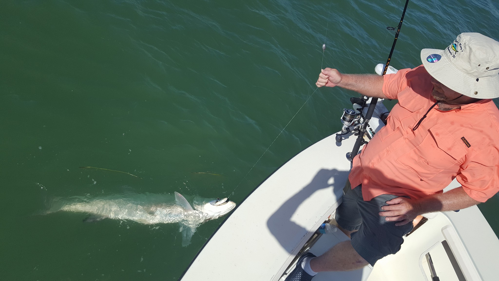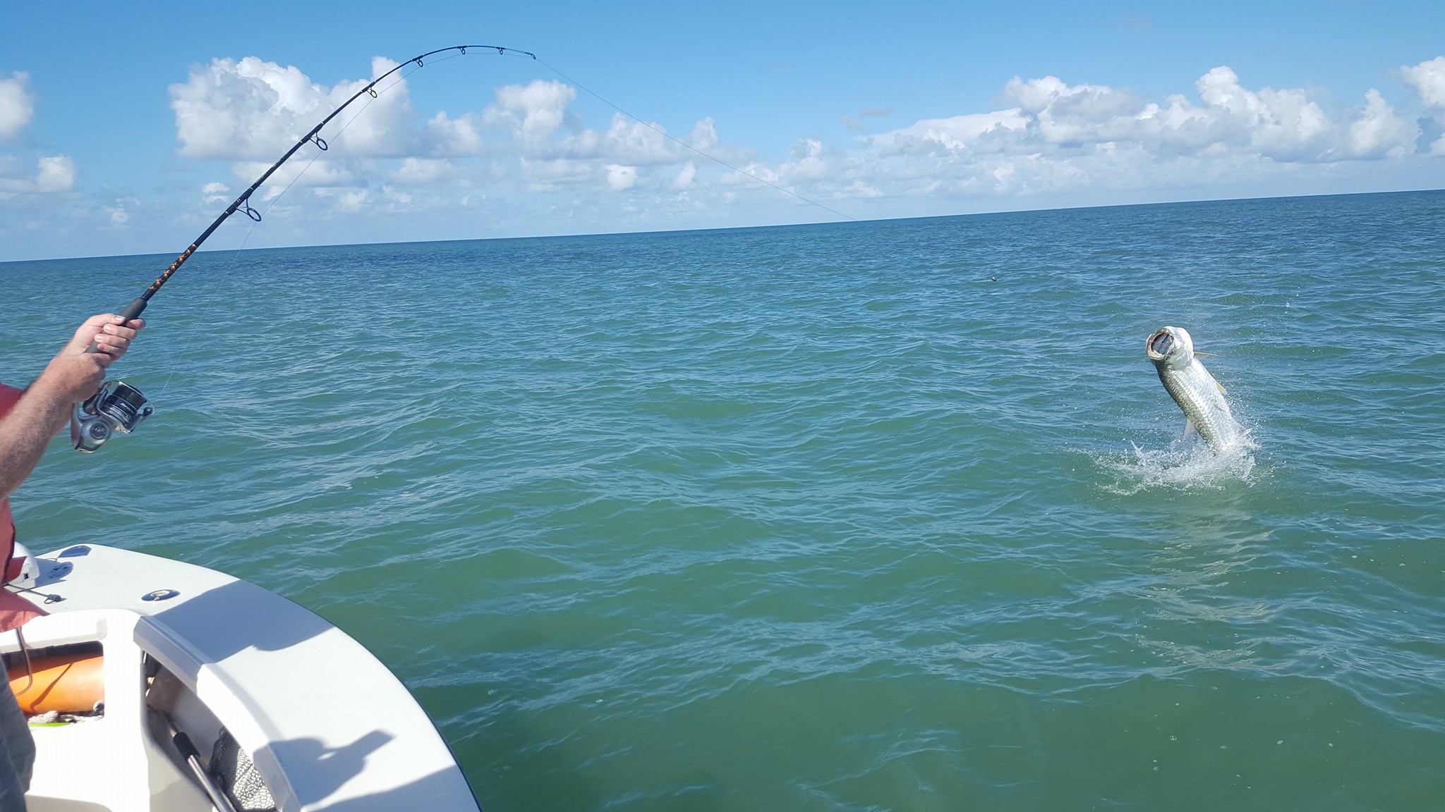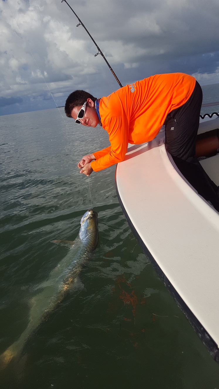 Got out with Andy Thompson and his boys Conrad and Derek again today. We focused more on tarpon today for most of the day. Bait was easy and we got to work soon after. Had the last bit of incoming tide, fished a channel I hadn’t hit in a while but heard there was some fish there. We found a good pack of ’em, and managed to catch a couple before the tide quit after an hour or so. We then ran out towards the mainland to try out there where we had done so good yesterday. Today we saw a lot of fish rolling straight away, unlike yesterday where they were not showing much. But it was tough to get to them the sharks were bad, we made several moves and just couldn’t get a bite and after 45 minutes or so the tarpon seemed to quit showing. We gave up and tried a few other channels, without much success aside from a few more sharks. We tried one last spot where fishing had been good a few weeks ago. We saw a fish jump out of the water and then a few roll in that area, and we set up and within 10 minutes hooked another tarpon. Got some good jumping video and photos and got him to the boat before he took off and jumped off. But had the leader for a release. I’m out the next couple days and then next week is slow so far, I’m going to be doing some boat work but will have another skiff to use in the meantime. August is great for tarpon so hit me up! 3 for 3
