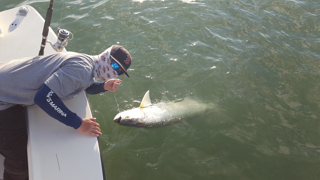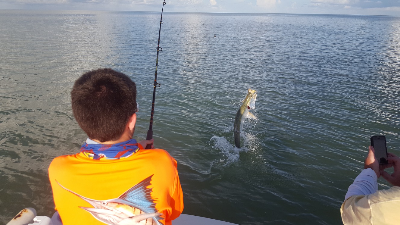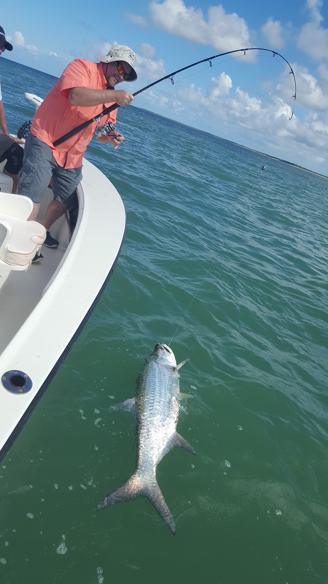 Got out with Andy Thompson and his boys Conrad and Derek again today. We focused more on tarpon today for most of the day. Bait was easy and we got to work soon after. Had the last bit of incoming tide, fished a channel I hadn’t hit in a while but heard there was some fish there. We found a good pack of ’em, and managed to catch a couple before the tide quit after an hour or so. We then ran out towards the mainland to try out there where we had done so good yesterday. Today we saw a lot of fish rolling straight away, unlike yesterday where they were not showing much. But it was tough to get to them the sharks were bad, we made several moves and just couldn’t get a bite and after 45 minutes or so the tarpon seemed to quit showing. We gave up and tried a few other channels, without much success aside from a few more sharks. We tried one last spot where fishing had been good a few weeks ago. We saw a fish jump out of the water and then a few roll in that area, and we set up and within 10 minutes hooked another tarpon. Got some good jumping video and photos and got him to the boat before he took off and jumped off. But had the leader for a release. I’m out the next couple days and then next week is slow so far, I’m going to be doing some boat work but will have another skiff to use in the meantime. August is great for tarpon so hit me up! 3 for 3