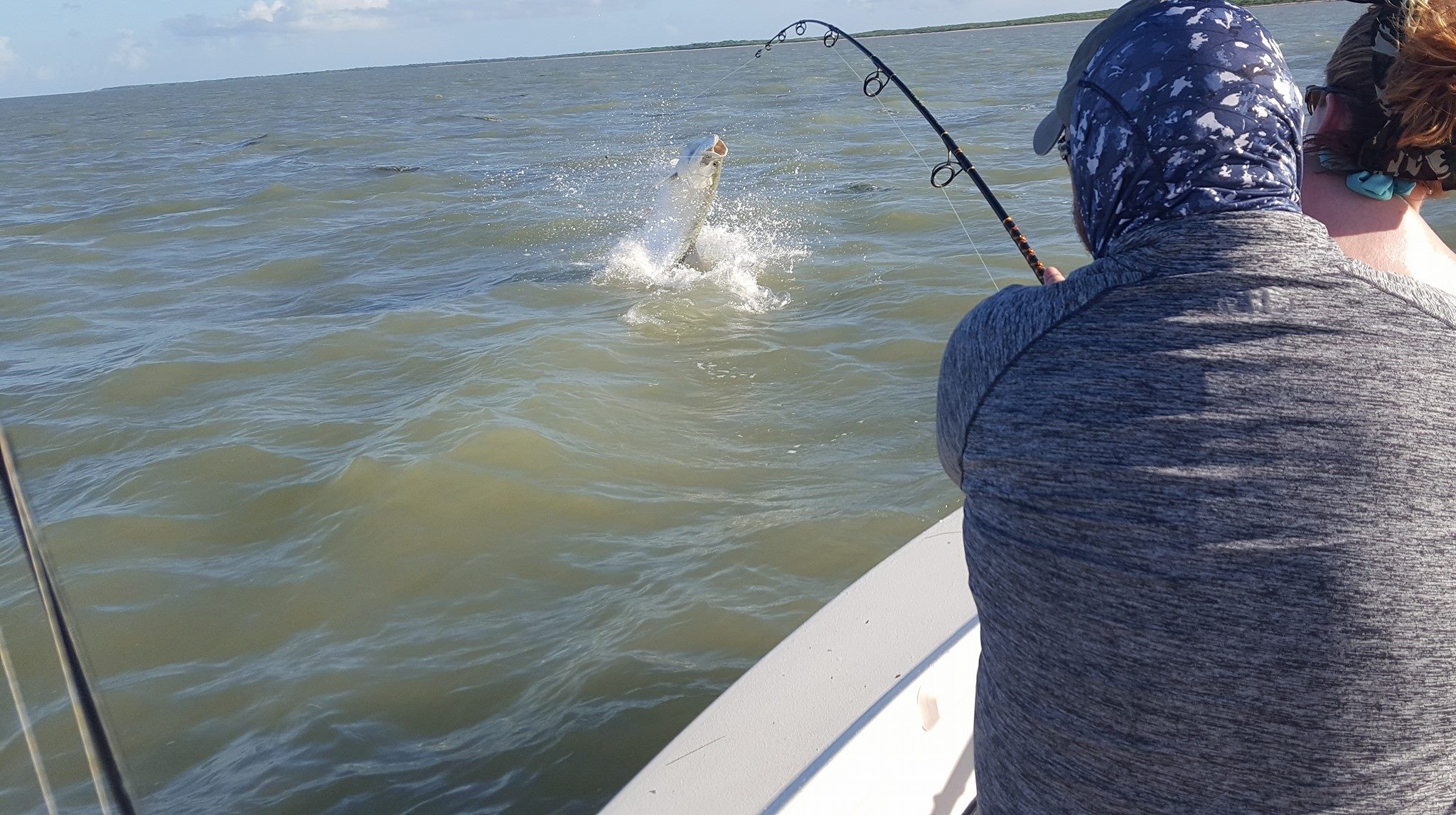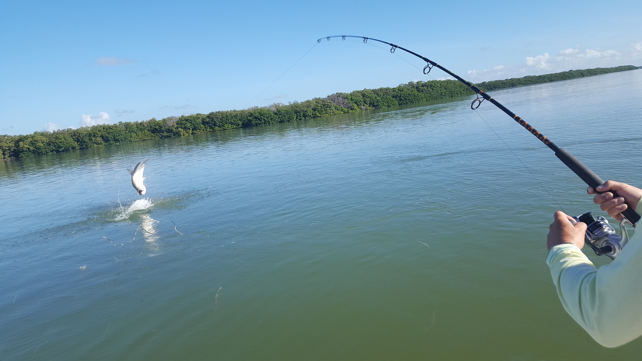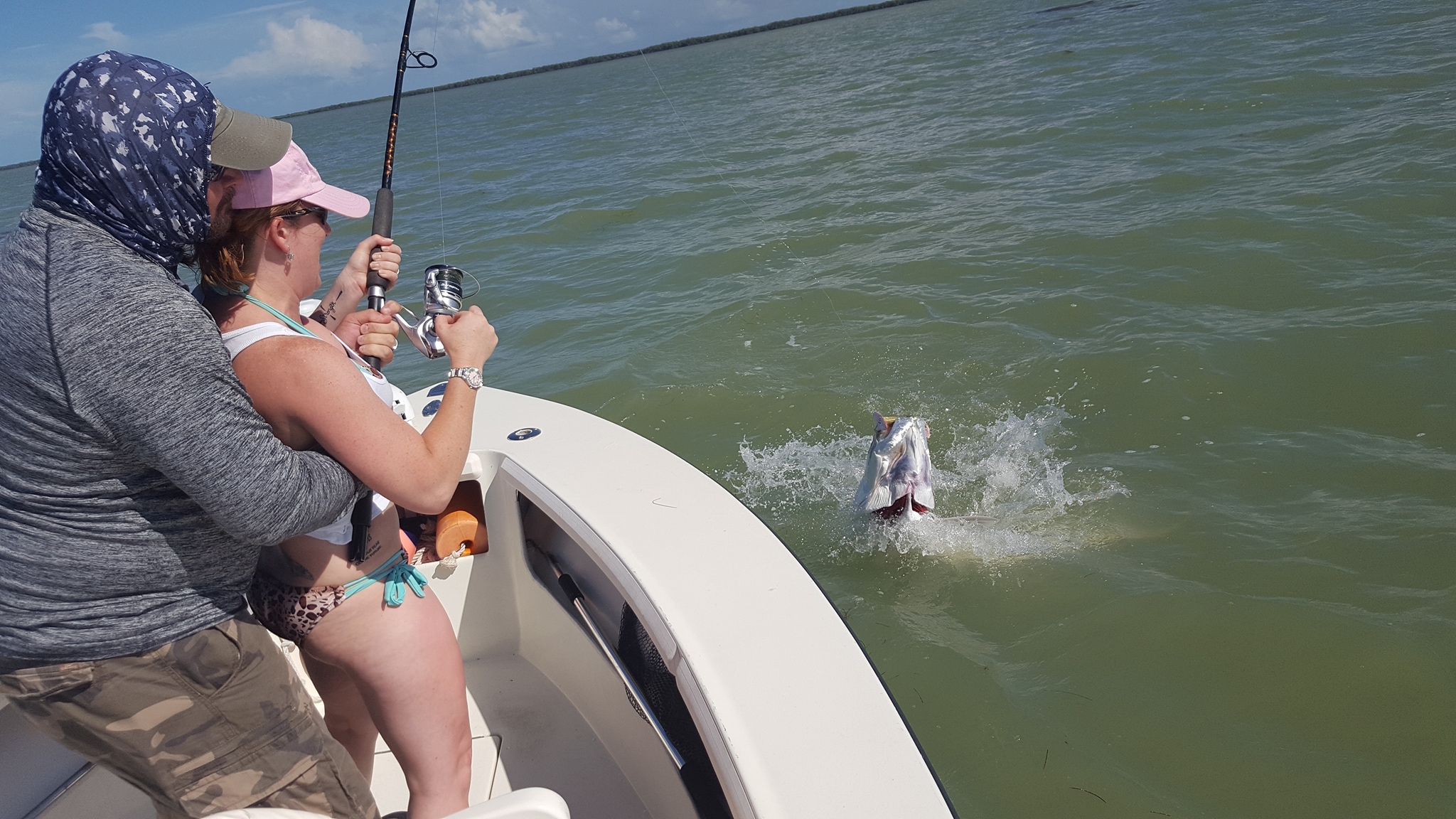 Got out with Scott and Amber down from WV today for a 3/4 day. We had thought about doing a full day but just played it by ear. The fishing was very good on the early falling tide much better than yesterday so we figured we’d just fish till the tide was done and call it a day. We had a ton of action unfortunately the tarpon though just weren’t staying on the hooks for us. Not really much angling error, just funny bites. They were grabbing it and throwing it as soon as they touched the bait never even getting the hook most of the time. We tried changing bait sizes, hook sizes, hook types, but nothing seemed to help. But it was still fun to watch and that is fishing! We did land one giant fish of about 120 lbs that Amber and Scott took turns on for about 30 minutes. Got it up to the boatside but never where it rolled over for good pictures unfortunately but we got some good video and jump shots at least, and a technical catch with the leader to hand. That was the 2nd bite, and then we proceed to jump I think about 10 more fish, and finally things slowed down and we waited and Scott got to catch a little guy that stayed on for us. About a 20 lber. It was great fun and they were glad to each catch one, I would’ve liked it to been more but it was just one of those days. At least I know where I think I’ll be tomorrow again! 2 for 12