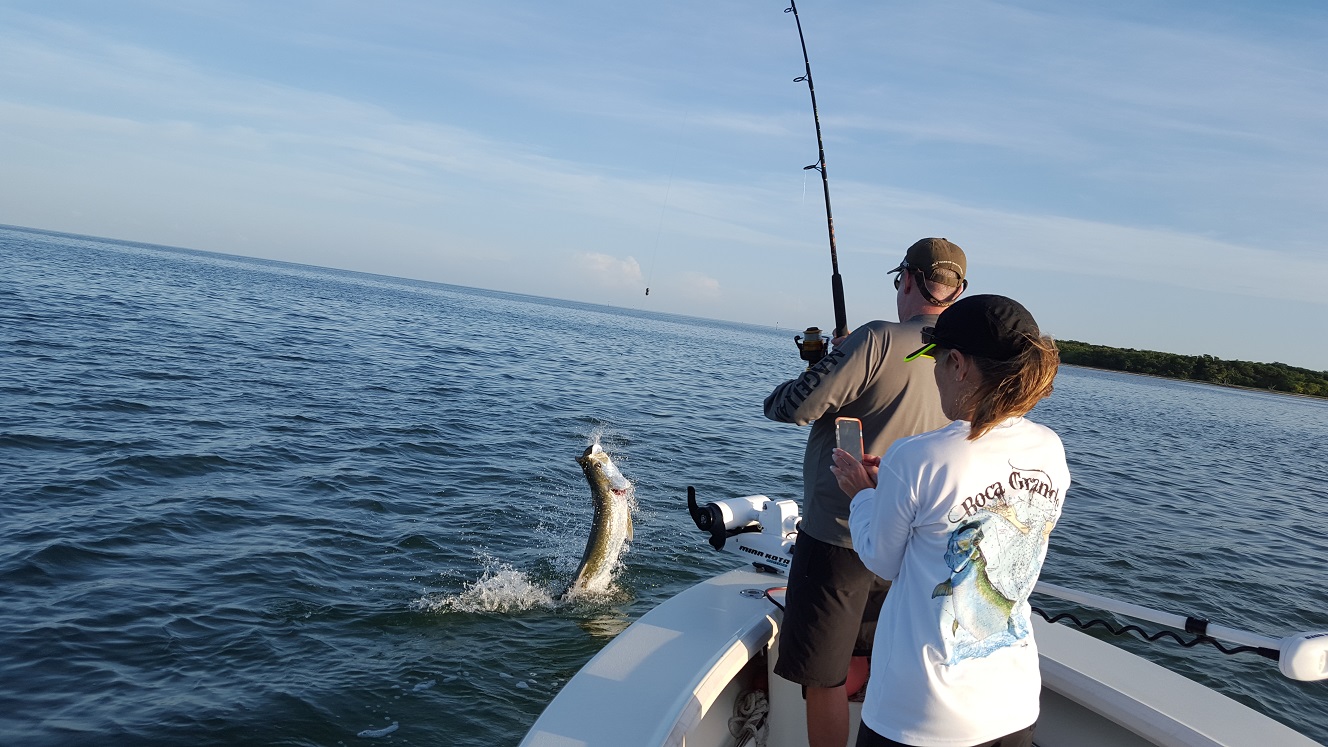 Well had Friday off for some boat maintenance and then I fished yesterday morning but not for tarpon just trout, snapper, etc… Though last night I went out with a few friends for a couple hours and we tarpon fished. Luckily during the day yesterday we ran across a big ball of mullet and I was able to put a few away. Last night we fished close by, sharks were pretty active the first hour and then we hooked a nice 50 lb tarpon Virginia caught. Good battle on lighter tackle. We fished another hour but things died down no more bites or activity and came in. Today I had a full day in the backcountry I had some bait to start with and we tried some channels where I hadn’t fished lately. Flat calm today we saw plenty of porpoises in there and a few tarpon rolling around. Tide was slack though once it started to trickle in we had a bite and caught a nice 40 lb fish. After that the fish seemed to have moved on we only saw one more roll and then they quit. We caught a few more baits the same ball we had seen the day before. Tried the beaches and saw more fish out there then I had seen the last week but they did not want to cooperate. We moved around several times and saw a couple jumpers and a handful rolling around but just sharks, though we did get 4 hammerheads which was cool. After that I tried another area and we saw tarpon there too, again moved around to get in front of them a few times, but no bites. We finally tried again close to home and even saw a couple tarpon there roll eventually but still no bite. Anyways good to see fish around in several different areas, they will start feeding again at some point! 1 for 1 and 1 for 1