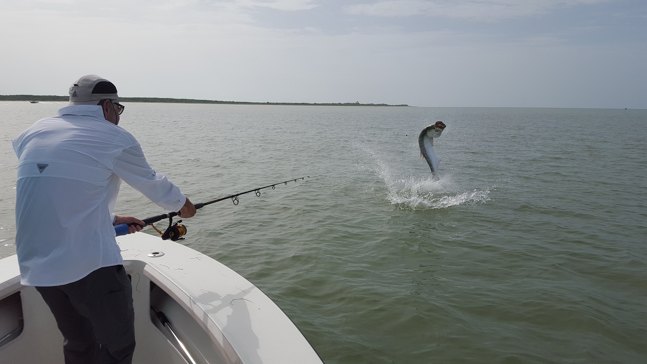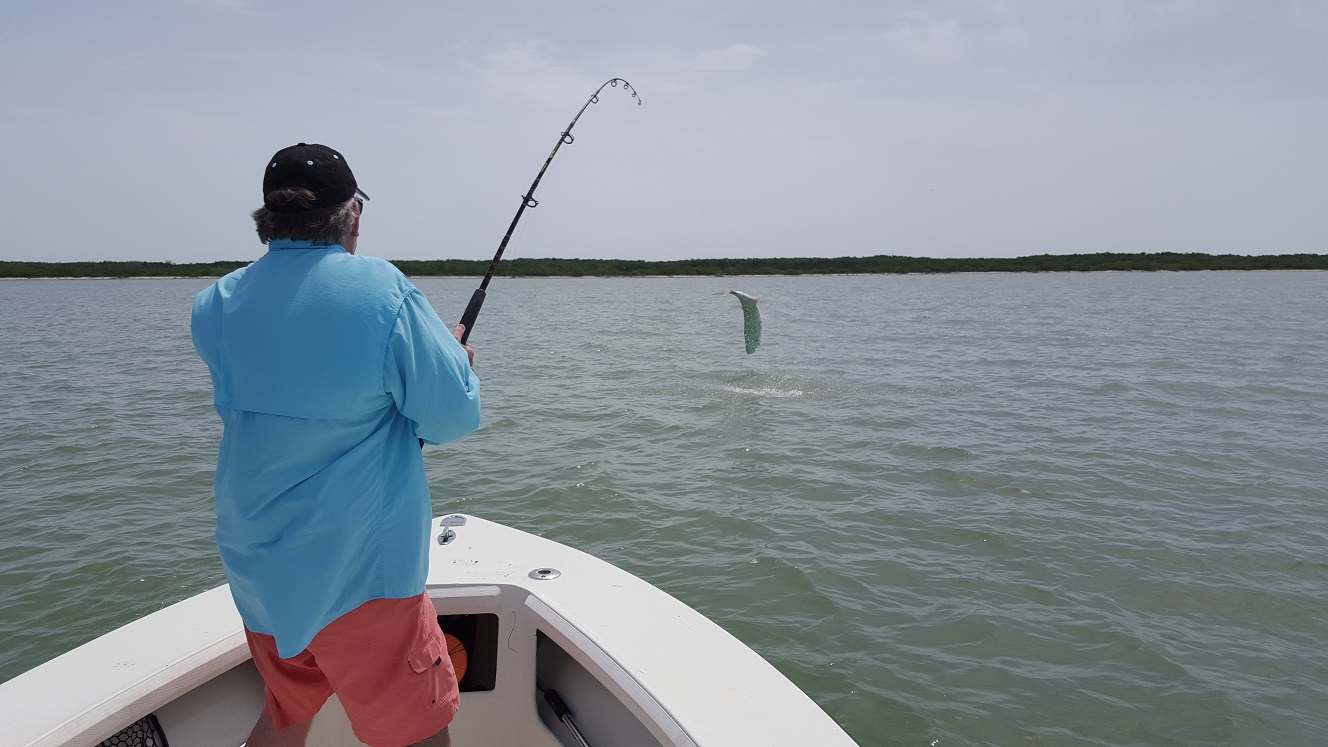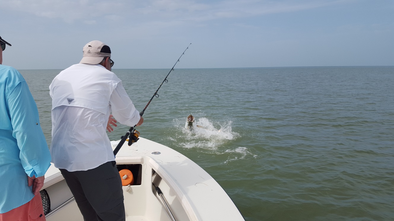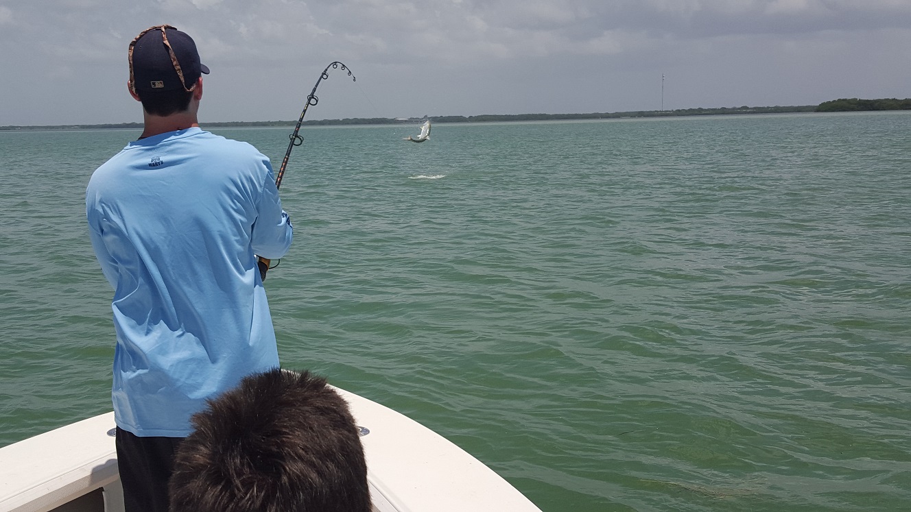 Well had a day off yesterday and then Andy with his boys Derek and Conrad again today. Had some bait leftover from our trip the day before yesterday but we tried to get a few freshies. They weren’t easy and I was glad we had some to start with. They were running hard when I got there and one toss we only got 1, then on the other end of the channel a group came out already moving but not super fast. Was able to get one good toss of about 15 baits, mostly black mullet again. Anyways we checked some channels and did not see much life it was flat calm to start then we tried off the beach. Tried one area on the end of the falling tide and did not see much life, a few sharks. Then we ran where the fish had been the last few days as the tide was starting in. Did not see anything as far as rolling or busting fish which was funny. Though we eventually did get a bite we missed and soon after another 90 lber that Conrad hooked and landed again. A longer 45 minute battle. We caught plenty of sharks including a big lemon. After that we kept at the tarpon and tried the channels where we found them the other afternoon. Though this time it was all lemon sharks. We caught about half a dozen and it was super hot – i noticed the water temperature was about 92! Anyways we had about 30 minutes left and we tried another close by channel. I was counting down the seconds before winding them up when Derek had a bite and as soon as he felt pressure up came about a 50 lb tarpon! We were very happy and the kids came through ‘clutch’ again! 2 for 3