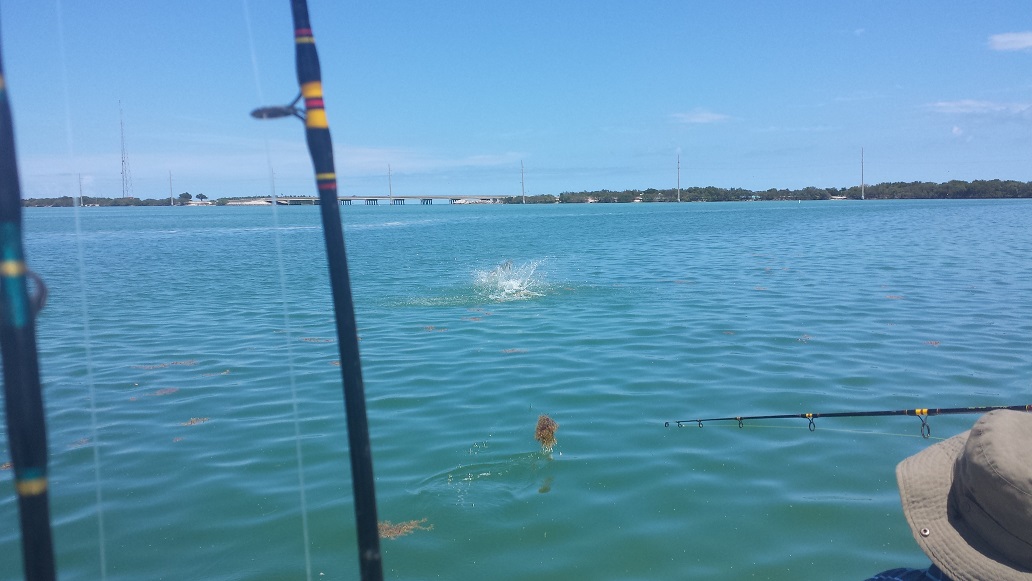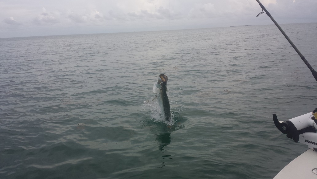Dreary looking morning we had lots of weather around for our june islamorada tarpon fishing this AM. Though it passed north of us and kept it overcast which was fine with me as it’s been very hot lately. We had good tarpon action first thing, I had caught mullet the afternoon before and we kept some alive which was good because there were not many around this morning when we looked. We had some cheap shots and a couple good live bait bites, then finally hooked a fish. We jumped him off and then hooked another one shortly after that we caught of 60 lbs or so. After that it was pretty much over we had one other cheap shot, and the current got weak and lots of sargasm weed around so we moved. No tarpon in the next area so we went and did some light tackle stuff for a while. Tried the tarpon in the backcountry and we got some sharks but no tarpon. We tried another spot on the way home and it didnt look real good – very green, hot water almost 90 degrees. But I did see a couple tarpon roll and right before it was time to go we hooked a nice 40 lber that we caught to finish the day. So 2 for 5 on the day not bad.