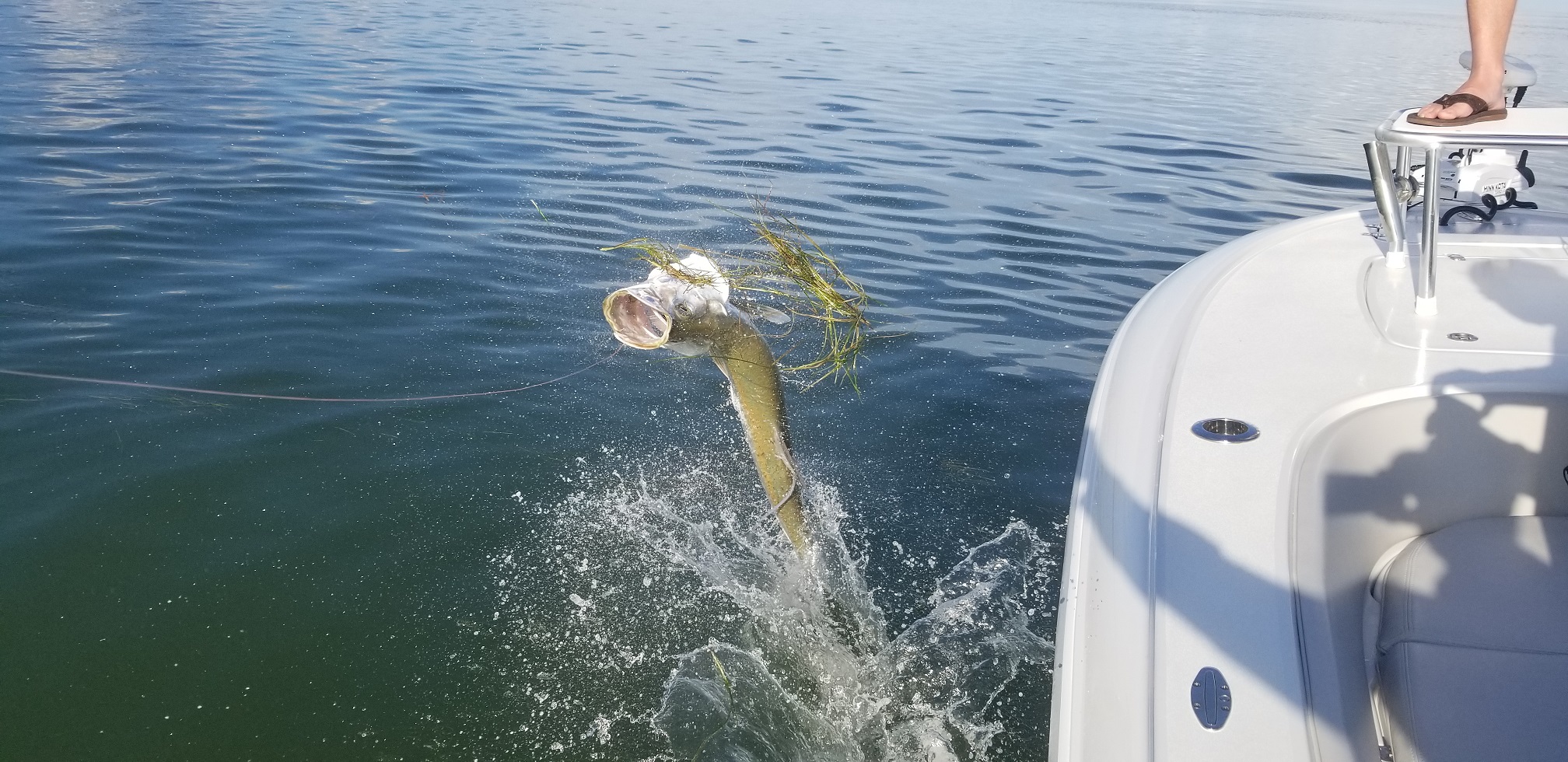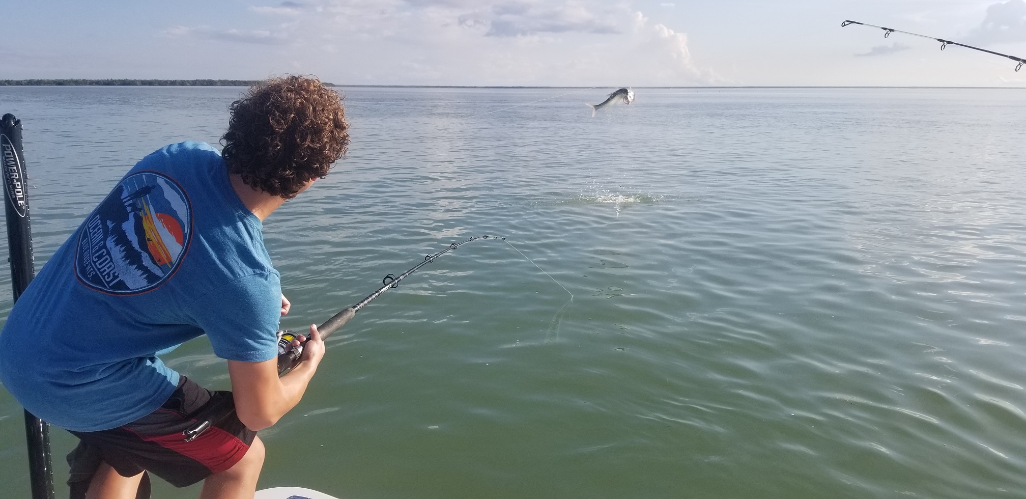 Got out with Peter visiting from Australia today for a 3/4 day. It was a little wet to start but once we got into the backcountry we never had another drop. Bait was fairly easy so we loaded up. We found tarpon where we first stopped, had a good bite right away that we missed and then the sharks moved in. The tarpon seemed to thin out quick, and after 30 miuntes we made a move. Found more tarpon in spot 2, where I’d been seeing them most regularly lately. Unfortunatley they were kind of hard to line up on, just kept moving around and as soon as you’d stop, they would seem to be somewhere else. We fished hard, caught a couple big jacks and some sharks, and finally jumped 1 more tarpon off. After that the tide started to quit. We moved again and saw 1 fish roll but with slack tide no response. So we ran back to where we first started as the tide would be falling there now. Saw more tarpon there, but again hard to line up on. We moved 3 or 4 times, and the sharks were pretty thick and didn’t get another tarpon strike. Anyways we gave it a good effort and had a couple shots just couldn’t keep ’em on the hook. At least there were a good amount of fish to see, could definitely get better and September may be good – who knows! Back at it tomorrow. 0 for 2