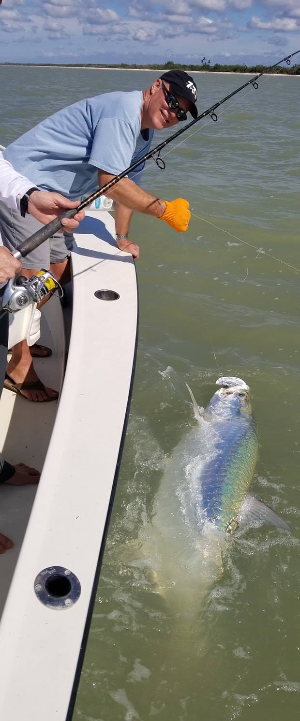 Wild and crazy day for Joe and Mike! Joe had emailed me last week checking if I had anything available. Fridays normally a day off for me, but I had an open day early next week and conditions looked so good, so we switched those around and made it happen. Fishing was on fire! We fished three different areas and found fish everywhere we went. Joe landed two tarpon, one biggun’ around 110 lbs and a medium 65ish lber. Mike got a few too about a 120 lber, a 60 lber, and finished with a 35 lber. We even had a double header on for a second but lost one, and a few other bites we missed. Also bagged us a nice tripletail about a 10 lber. Glad we made it out! I’m off tomorrow but looks like it’s gonna be a nice day out there. We should have a few more good days of early season tarpon fishing, but looks like a late cold front next Tuesday/Wednesday, which will likely slow it down for a few days. 5 for 9