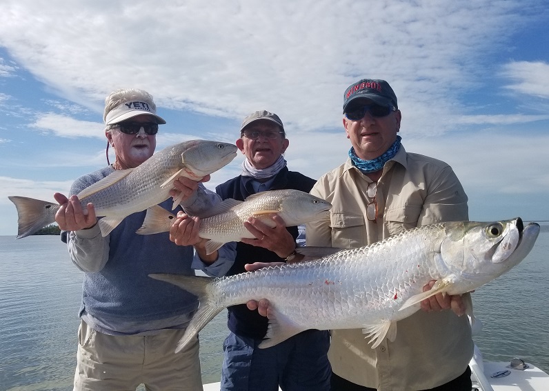 Well we had a good hard cold front the last couple days. Today was the warming trend… the water was still cold but the wind swung east throughout the day and lost the bite of cold. We had a banner day catching nice snook and redfish, but in the late morning it calmed down and really warmed up. A few tarpon started to roll and we started pitching shrimp to them. We caught 3 of them, two little guys in the 15 lb range, and one probably around 20 lbs to top off the day! The last one we caught while fighting two redfish as well which made for a nice triple header! It’s very hit or miss with tarpon right now, but throughout the winter you can catch small guys like these on shrimp occasionally. I usually don’t book charters specifically for that, but rather when we are fishing spots for snook or redfish and they are around, you can work your bait differently and sometimes entice a strike. If it gets warm and calm though, the big boys can show up and it can be game on. But the winter time fishing so far for snook, drum, and redfish has been very stellar. Check out my other website www.fishingislamorada.com for those daily reports. 3 for 3