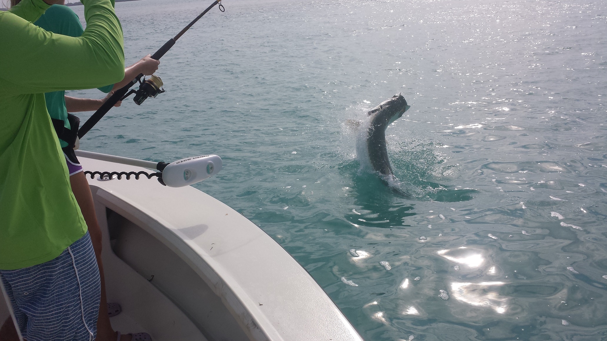 Well the front has came and gone. This morning we still had northerly winds and it was a bit chilly and overcast. The north wind is not great for the tarpon bite but we gave it a try anyhow. We fished hard for about an hour or so and finally got a good bottom bite. Nice ~100 lb fish came flying out of the water. We chased him through 3 different crab pots, unwrapping the wind-on leader from each one. Thankfully we did not lose him. I had Steven, grandson of Vin Sparano, who is a long time editor of Outdoor Life and close personal friend of my family – specifically my father. This was his first tarpon and he was very excited. Later on we did some rod bending and dinner catching. Tried the tarpon again in the afternoon. We set up with the tide opposite and the wind had swung now to the east, much better. However the tide was into the wind where I was fishing making things a little tougher. We got a bite on the live mullet after 30 minutes or so, big busting fish that screamed drag for a second but then spit the bait unfortunately. No other action and we called it a day after that.