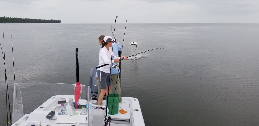 6/9/19 – Got out with Erik, Dan, and Marc today. Weather was very iffy, lots of rain and thunderstorms around. But we ventured out back. Bait had been tough to come by, even shrimp for our other styles of fishing. Luckily I had some shrimp and pinfish put away. We looked for mullet early but no luck. So we decided to focus mostly on snook and redfish for the day. We got rained on a good bit, and had to dodge some lightning storms, but eventually it got nice and we had a really good day catching a ton of redfish and good handful of snook. We didn’t really try much for tarpon but did give it a shot for the last 45 minutes or so with the 6 baits we had just close to home as weather wasn’t letting us get to where I wanted to go further. Caught several jacks but never had a tarpon bite. But again bait was hard to it was more of a long shot but we did have good fishing otherwise. 0 for 0