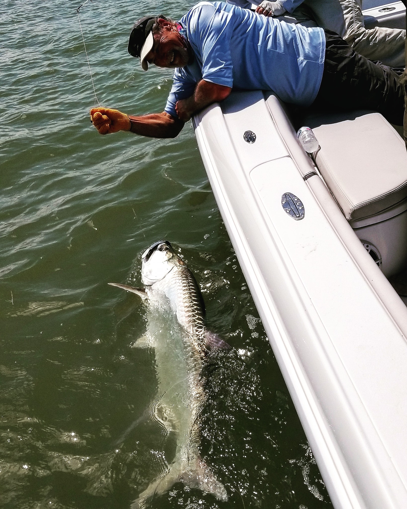 6/10/19 – Well we got lucky late in the afternoon yesterday the bait showed up and I drove back to the marina and was able to catch a good bit with a throw of the cast net. So today we did get to try a bit more for tarpon. We started with snook and redfish which was very good we had probably 40 reds and 15 snook, including a couple big snook on our pinfish. The rain finally cleared and we decided to run further and check an area where we did good with tarpon last week. We found a good load of them, and middle of the day we ended up catching 5 tarpon and jumped 5 more! Incredible fishing for just a short hour and a half window. We caught 2 double headers, and another single and we had 3 other bites while fighting that one we missed – just awesome! Was able to round a few more baits up this afternoon too, so we’re in better shape on that front. May give them a try again tomorrow. 5 for 10