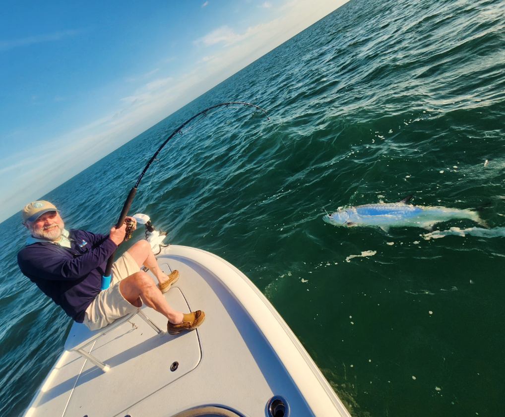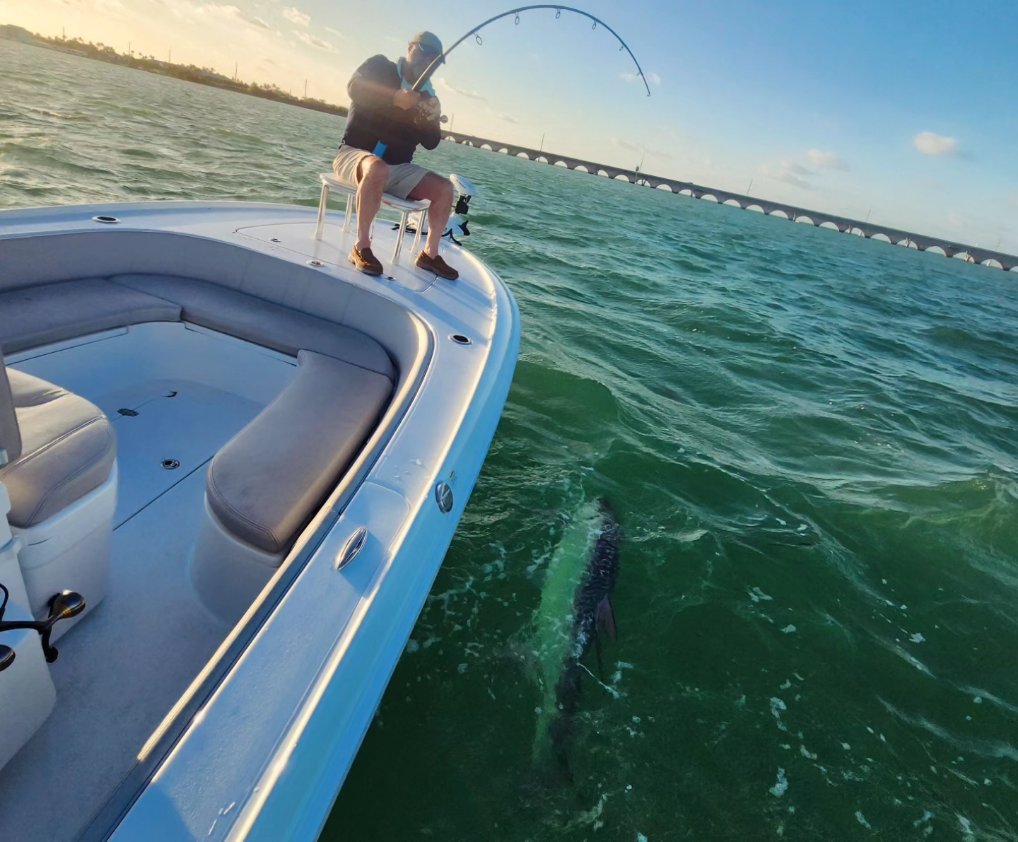 Got out for my Monday, Tuesday, and Wednesday season trips this week.  Weather was a bit windy overall though Monday started out nice and it started blowing around mid-day mostly out of the East which isn’t a bad direction for where we were fishing.  Tuesday the wind had stayed blowing and slightly more Southeast which made it a tad rougher on the oceanside but not too terrible for the Contender Bay Boat I’m in, and Wednesday was more of the same of that.  Fishing was really good it was about the best I’ve seen it so far this season.  Monday we started out with the tide rolling in and again slightly calmer wind.  It was action from the get-go I had return customer Ken and his son and neighbor.  They got on tarpon from the start and we ended up landing six I think.  A big hammerhead shark got the first one unfortunately.  The bite was strong we ended up having a dozen bites or so at least so that was good to see.  The later morning/afternoon bites were all ‘short’ bites though they kept grabbing baits and spitting them out pretty quick.  Tuesday a little slower but still pretty good I had Greg down from Maine.  Our first 4 stops we ended up hooking three fish and catching all three.  The first one we got to the boat for pictures which was great – sometimes that is a hard feat especially when you are fishing in 20 knot winds and only have one guy on the boat.  The next ones the first we broke off boatside and the other we got leader on several times but eventually he made his way into the bridge and broke off.  After that we had to work at it a bit more the tarpon got a little finicky.  But we kept moving and seemed about every move with a fresh bait out if we were in a pile of fish we could encourage a bite.  But we weren’t able to keep many on the hook after that.  I was joking with Greg how lucky we were to get that first nice fish up boat side like that and how it doesn’t happen that easily all the time… now he knows!  But still a great day I think we had seven bites or so and caught three.  Wednesday it was howling 20+ knots and a little more southeast again.  Definitely about the windiest it’s been for me lately.  But the Contender Bay Boat handled it beautifully.  Fishing was decent but we had to work at it.  We ended up hooking a big one right off the bat for T that we battled for an hour but we did manage to roll over and get great pictures so that was cool.  Then soon after that Bob hooked one we lost in the bridge after a bit.  After that a bit of a dry spell we hopped around and it was difficult with the wind trying to keep the boat in place, but we hooked a couple nurse sharks and then finally after a couple hours and several moves we got another tarpon.  A smaller one for Bob that we got to the boat but right as we were going to grab him a shark got after him so we broke him off but unfortunately he wasn’t able to get away from the shark though he tried his best and we tried to bump the shark away with our boat.  After that we ended up having a few more bites some that we missed and lost another one in the bridge.  So overall productive day with a half dozen bites or so and two landed fish… not bad for a really windy one.