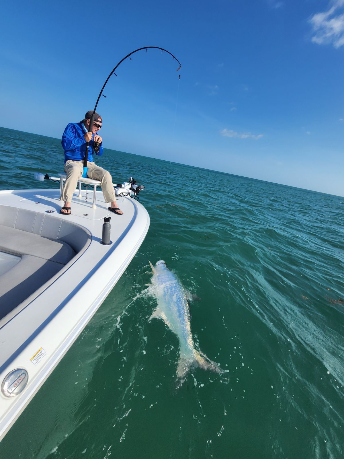 Got out with Bruce, Darcy, Asa, and Evan for a day trip of tarpon fishing in Islamorada!  Conditions were pretty good again moderate southwesterly wind actually but it had just enough west in it to make it not too crazy rough.  When it goes due south it’s definitely worse.  I was hopeful as yesterday we had good fishing and sure enough today did not disappoint.  We had to work at it and jump around but very similar day to yesterday… we had a couple little rallies where we got bites fairly quick, and then a few times we sat for nothing for an hour or more.  But we ended up landing 3 and getting a 4th one on the leader we broke off I think and lost a few others.  No shark problems today which was nice.  Good to see some solid fishing and not too much boat traffic where we were, but I’m sure it’ll start getting busier here soon.  I’m off for a few days but will be back at it Monday next week!