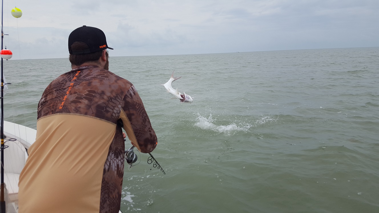 Got out with Aaron and his dad again today. Tarpon were still on the list and we ended up dedicating the day to that. With the way the fishing has been sometimes that’s what you must do. We tried early with the same routine as yesterday, today however the fish just didn’t want to bite… We had them rolling and busting around us but never had a sniff. After a little over an hour we gave up and got some live mullet from the local bait guys. We ran down to the bridges to give it a whirl. We found a few fish in the back channel of one of the bridges, and had a cheap shot soon after getting the baits out. Never had a solid bite though and then the tide quit there. We looked around and fished a couple more areas waiting for the tide to start but didn’t see much. Finally the tide got falling and we ended up finding some fish nearer to the bridge. We set up and after a little time started to have some action on our live baits. We had several more cheap shots and finally started getting some solid bites! Unfortunately the tarpon were tough to keep on the hook, we missed quite a few. The baits we had were size large so that didn’t make things any easier… Finally after we had just about given up hope and decided to stick with it, we hooked one and got him to stay on. Keith landed a nice fish of about 80 lbs and was thrilled! I think we must’ve had 8 or so solid bites and maybe 10 other cheap shots, when you get that much action you hope to at least get one to the boat which we did so we were happy. After that we tried some an area close to the marina again for the last hour or so but didn’t have any luck, just caught a nurse shark. Anyways it was nice to get to see such good tarpon action on our live baits, would of been nice to have caught a few more but that’s why they call it fishing. As long as we are getting bites I’m happy and it’s always nice to catch one, make you appreciate them that much more when it’s tough! 1 for 8
