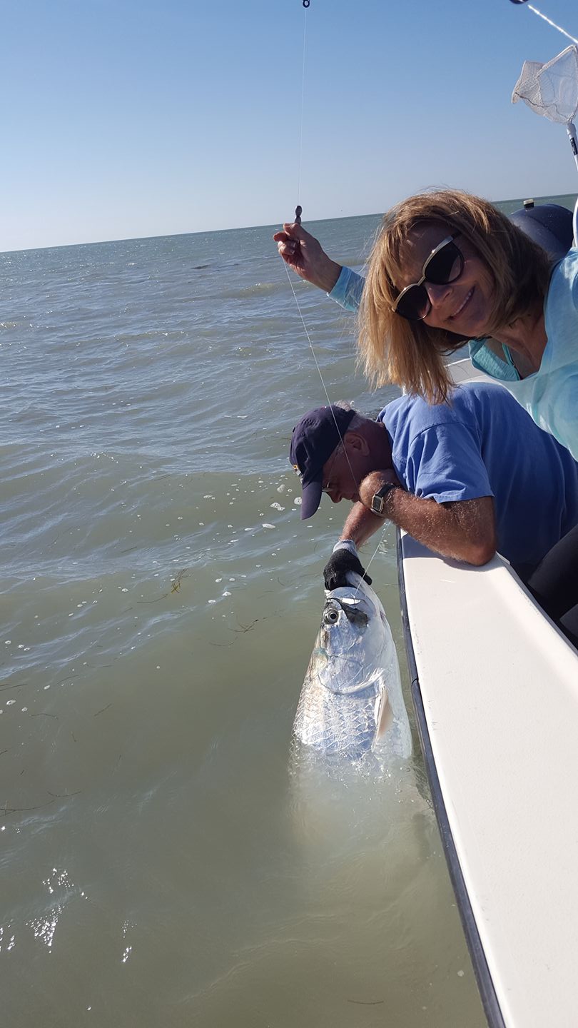 Got out with Jim and Gwen today, two of my longest running customers and some of my favorites. Winds were kicking out of the southwest pretty good as we have another front coming in. We had some bait left over from a few days ago and we hit the channels looking for some tarpon. We found them in the first place we stopped, had nice falling tide that would last most of the day. We caught a few sharks early then Jim jumped a nice tarpon over 100 lbs! Too bad he didn’t stay on the hook though… After that we moved around a bit and caught a couple more sharks, then Gwen hooked a nice 70 lb tarpon that we landed. A good fight we had to chase it for a while but got some nice pictures by the boat. After that the tarpon seemed to slow down, so we tried another part of the channel. Saw a few on the bottom machine but no more bites, but we did catch some more sharks and a ‘mud marlin’ sawfish. After that it got rougher and we hid around the islands to catch some snappers for dinner and came home. With the front coming in tonight and tomorrow, I imagine the tarpon will slow down for a few days again… suppose to get down around 60 and they definitely don’t like that! But not going to get cold until tomorrow night so maybe there will be a shot tomorrow morning. 1 for 2