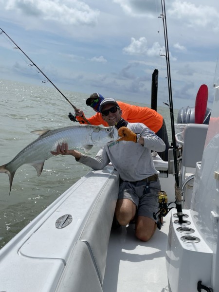 Yesterday we had a total swing around in the wind direction, it went from northeasterly to southwesterly. Luckily we loaded up with extra bait the day before because with the wind switch, the bait was gone today! That’s why we often catch bait back there even when we don’t necessarily ‘need’ it for the day, because you never know when you aren’t gonna find it! With the wind that direction, the fly fisherman were not in the same area as it gets a little rough and they don’t see the fish on the surface as much when you get those rolling waves. Though fishing was not all that great we never had a tarpon bite early we did mark a few good schools of fish and got set up in good position but no love just sharks. We gave it an hour and a half or so and then switched gears and went snook fishing. Snook fishing was really good and all we had for bait was small shrimp and a few pinfish, so we didn’t need to catch special bait but we still ended up with close to 20 snook, and had a nice redfish that got eaten by a shark, and had a few baby tarpon eat the shrimp as well that we jumped off.