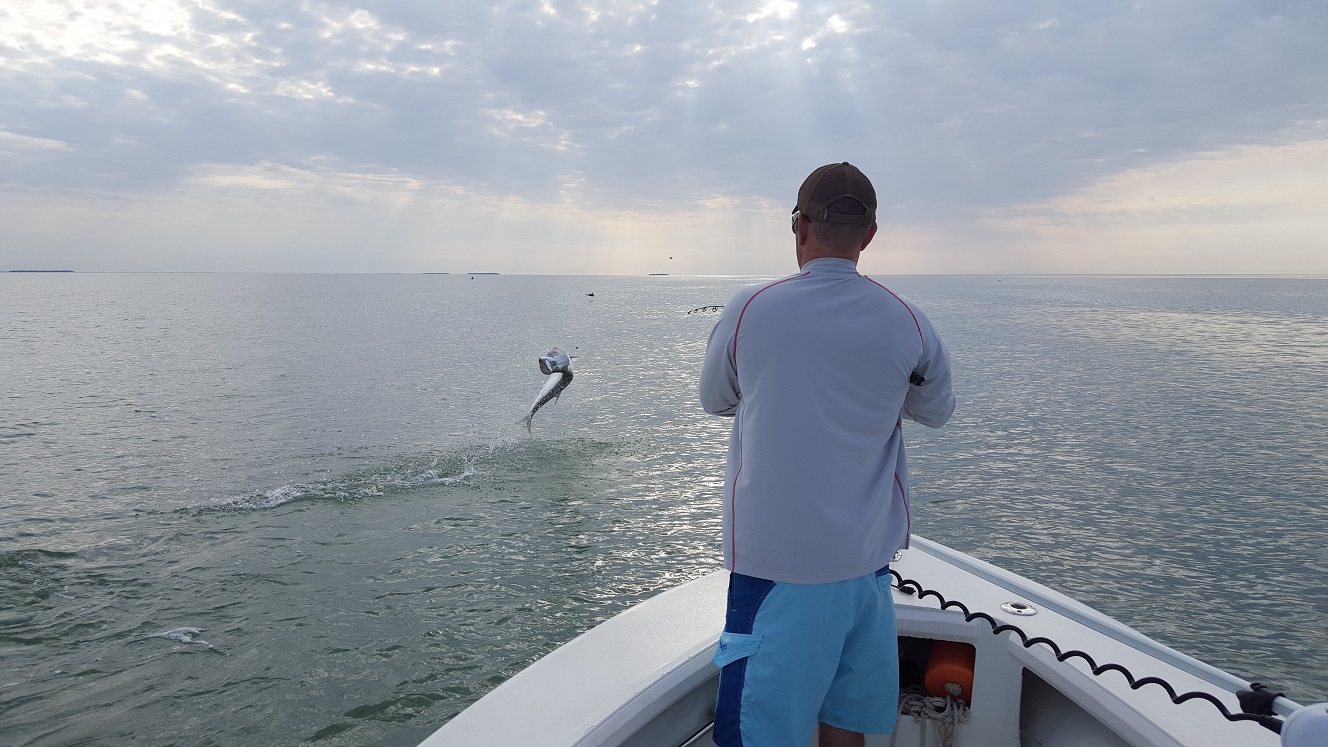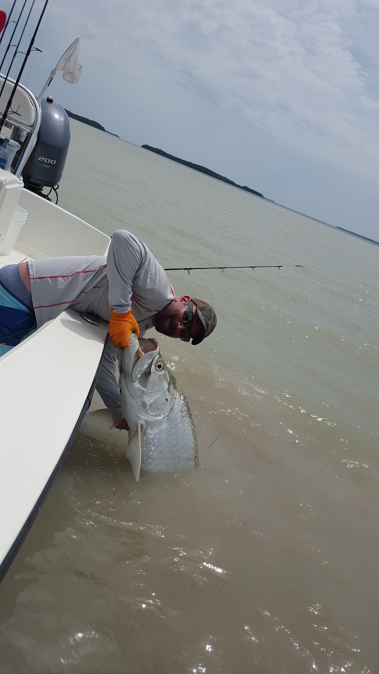 Got out this evening for the silver king. We fished 6 to 10. Had the last of the incoming tide with it slicked out, not much wind. I tried an area I hadn’t fished at all really this year and we saw a few fish rolling around. I moved and got lined up on them and we put our baits out. Had a couple sharks early on. After 45 minutes we finally hooked and landed a nice 90 lb tarpon. After that the tide quit and we moved back into the other channels to fish our crabs at dark. As the tide started falling and the sun went down the tarpon got very active. We had 3 bites on our first drift, jumping off the first two fish and then landing the last one about a 80 lb fish. After that we made three more drifts, on the last drift we had something crush our crab but not sure what it was. Anyways glad we were there while they were fired up and always good to catch a couple tarpon! Full day tomorrow though I may consider fishing a late evening again as I have an opening sunday, will take whatever trip comes first! 2 for 4