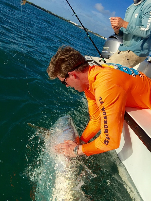 Had a half day today. We didn’t have luck with bait this morning. Also this afternoon I caught a bull shark in my net which tore a nice hole in it. Bait is still very tough hopefully once we get away from the full moon it will get easier! Anyways we ran into the backcountry where I was yesterday since it was so good then. We had the last of the incoming tide. Sharks bit us up we caught several black tips and a nurse shark. No tarpon and we fished for an hour until tide slacked. I ran over to the other channel nearby and we waited for the tide to turn, quick turnaround. Anyways we sat for about 30 minutes and things were looking grim plus we didn’t have too much longer to fish since it was only a half day. Eventually we got our bite though a nice 85 lb tarpon! Very funny bite too he did not run very hard he shook his head and almost thought it was another nurse shark. Anyways we landed him and then we had a few minutes left so I said we could give it a little longer. It paid off we had another bite pretty soon after and landed another 75 lb tarpon. It’s funny how it can go from balls to the wall one day fishing to hoping you’ll just get one bite the next – but that’s fishing! We were very happy to get two tarpon, and like I told the customers I’ll take catching 2 just about any day! Anyways two morning and evening half days the next two days so i’ll be back with some more reports soon. 2 for 2