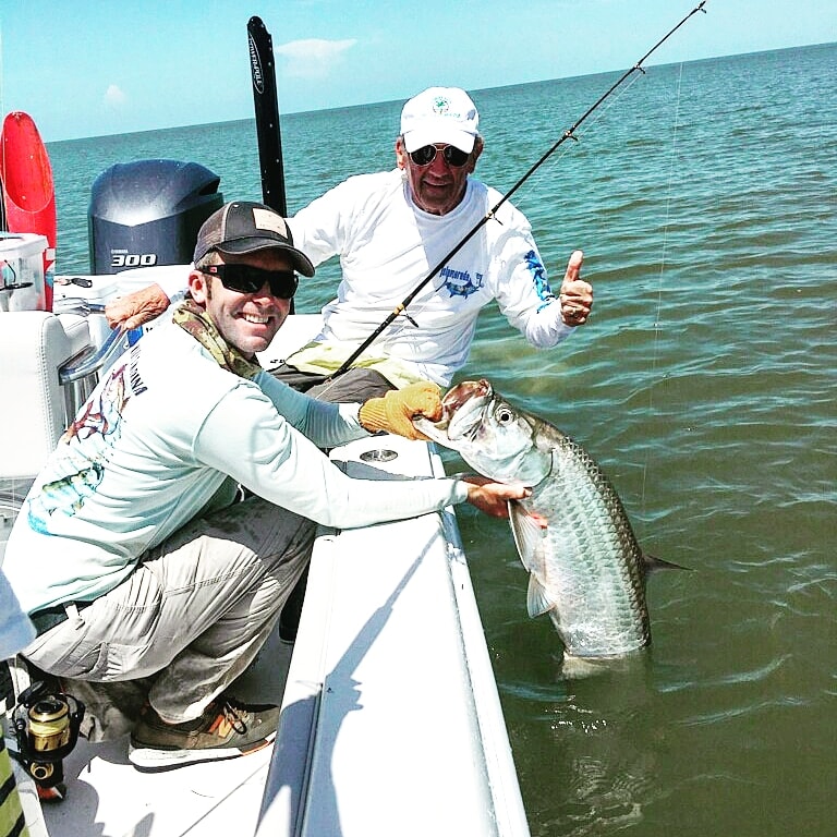 Fun day with Jeff and Katie visiting from the Pacific Northwest. Tarpon was on the agenda so we gave it a go. Bait was a little tough but made it happen. Fished a different pattern as we didn’t see a lot later on the day yesterday. But today we found a big group of fish at day break ! Within 30 seconds we were on and Jeff caught a nice 30 lb tarpon. After that I thought it was going to be easy living, but they clammed up and it got tough! A few fish hung around but the catfish and sharks got bad, and soon it seemed to dry up. We checked a couple other nearby areas but didn’t see much. We worked out way to another area and found some more tarpon. Katie jumped one, and then a few more sharks. Jeff hooked up again to a 40 lber. This fish went nuts, we got it boatside and it ended up jumping in with us. Luckily we got it out quickly without much damage. Things seemed to quiet down again and made one more move. We got a crack on a last tarpon, this one was a nice 75 lber! Katie fought it well and we got it to the boat for a few pics before heading on home. Nice day with great people! Back at it tomorrow. 3 for 4